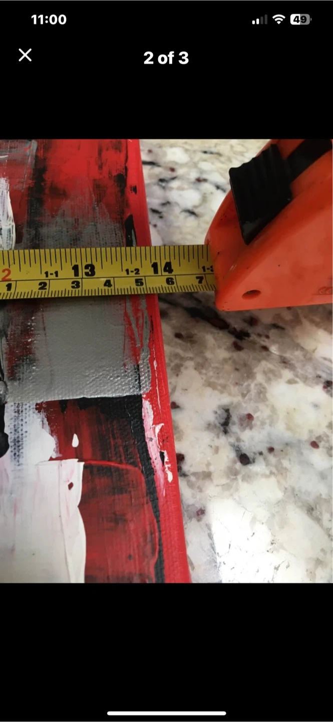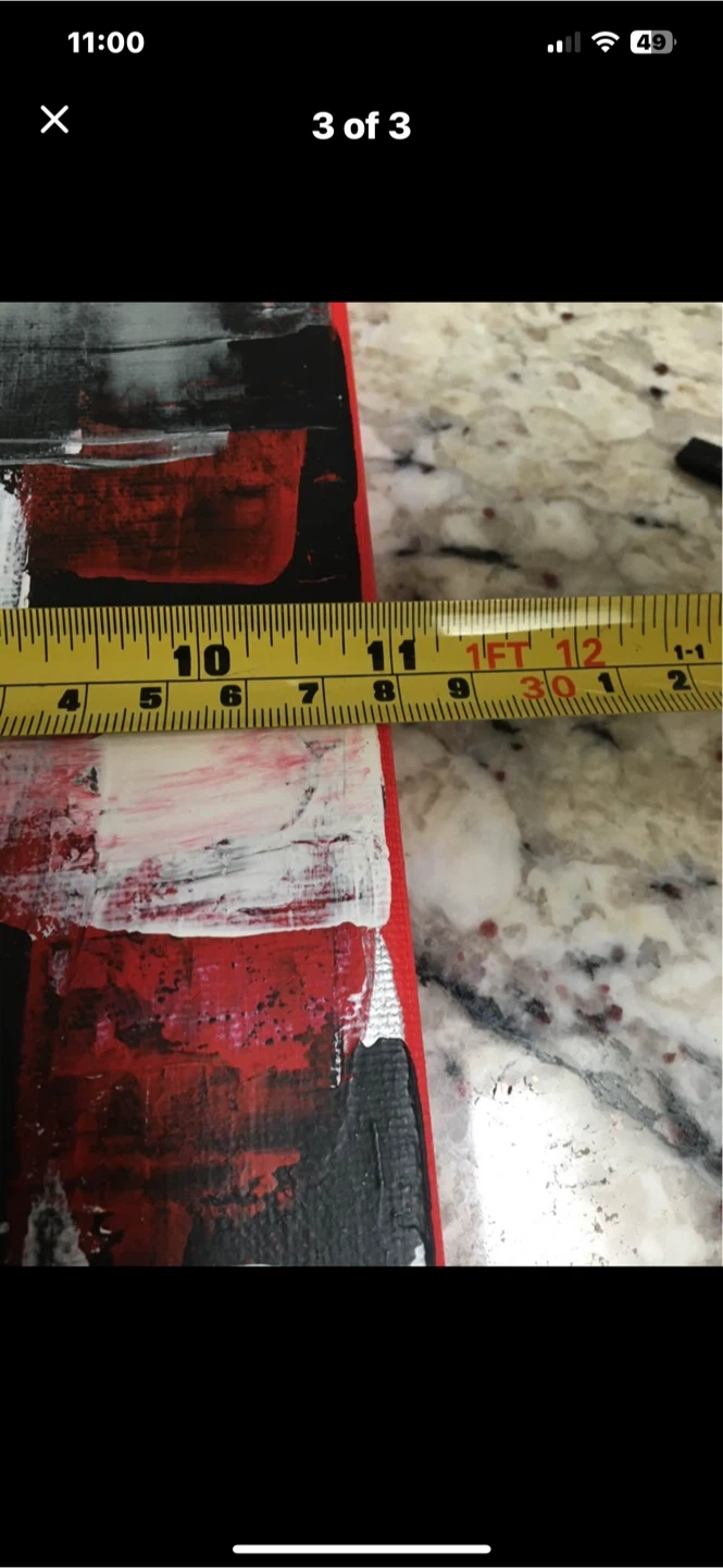 Selling an abstract painting featuring a striking combination of red, black, and white. The dimensions are approximately 14 inches by 11 inches. It's a unique piece to add some character to your space!