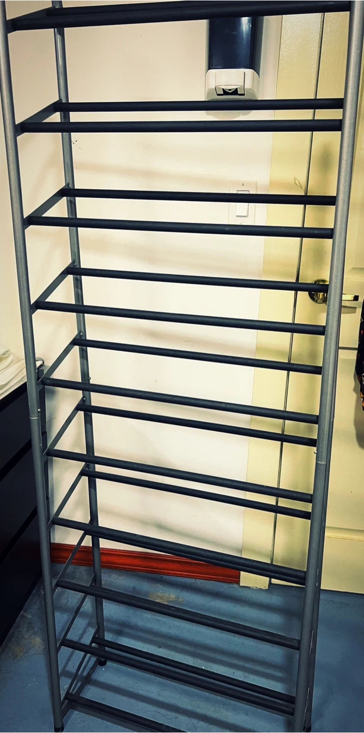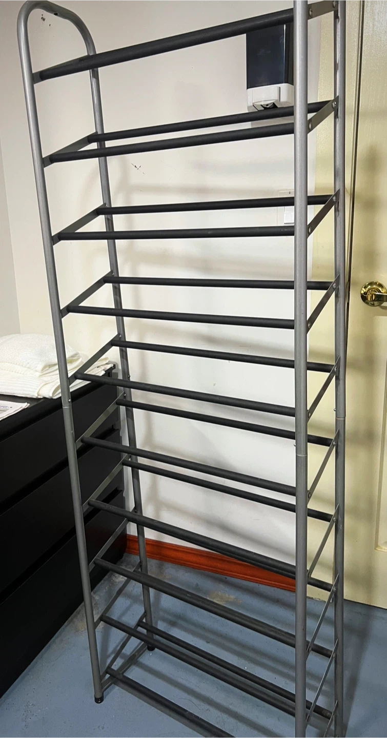 This is a tall, 10-tier metal shoe rack. It's perfect for organizing footwear and keeping your space tidy. The metal construction makes it durable for everyday use!