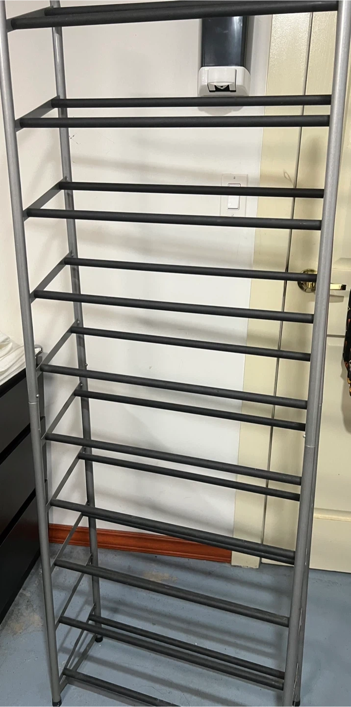This is a tall, 10-tier metal shoe rack. It's perfect for organizing footwear and keeping your space tidy. The metal construction makes it durable for everyday use!