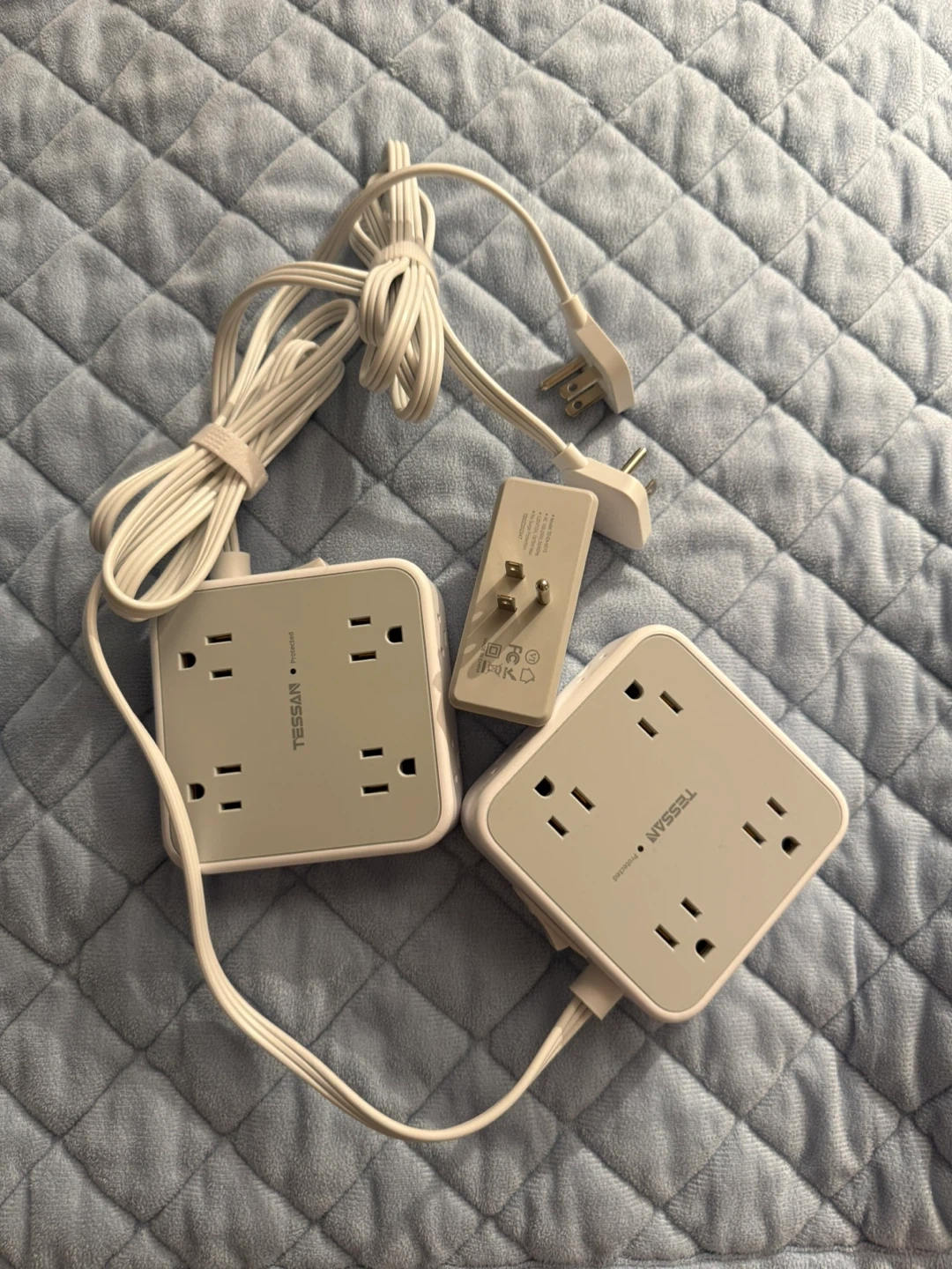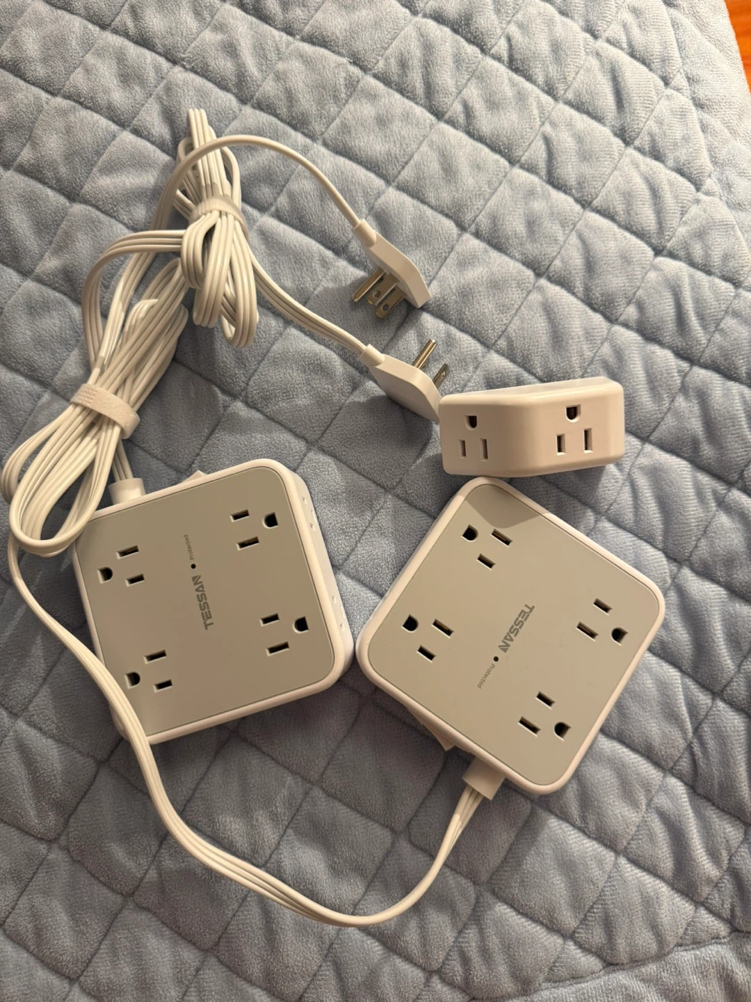 This set includes two cube power strips and a plug adapter. They're white and come with a cord. This is handy for expanding your available outlets.