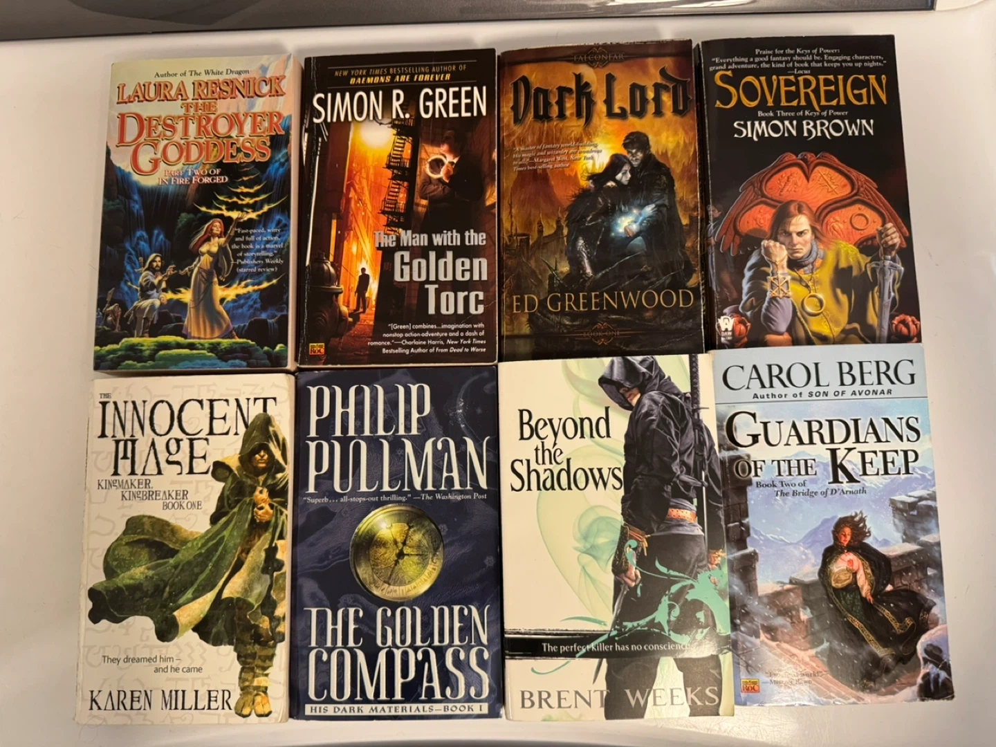 A collection of eight fantasy novels by various authors. Titles include 'The Destroyer Goddess', 'The Man with the Golden Torc', 'Dark Lord', 'Sovereign', 'The Innocent Mage', 'The Golden Compass', 'Beyond the Shadows', and 'Guardians of the Keep'.