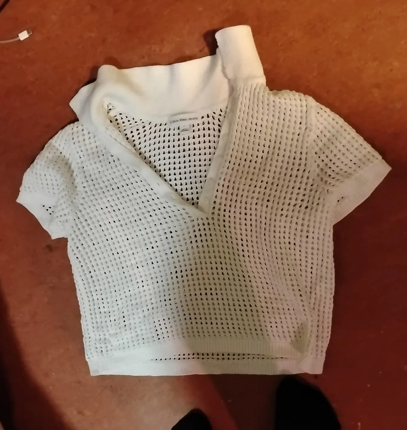 Selling a Calvin Klein Jeans white knit top! It's a stylish and breathable piece, perfect for layering or wearing on its own. The open knit design adds a unique touch to any outfit. Would fit a size small or medium.