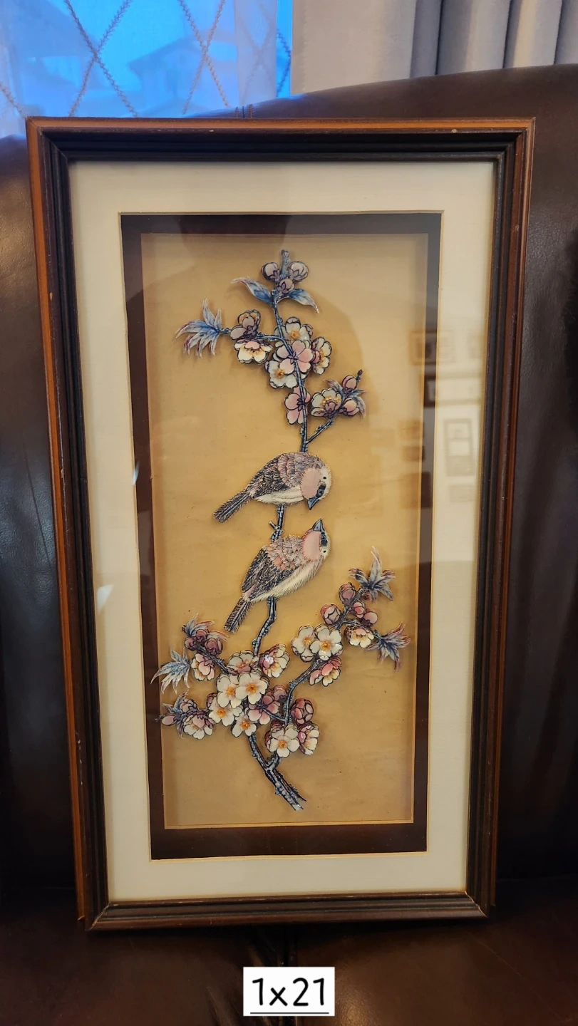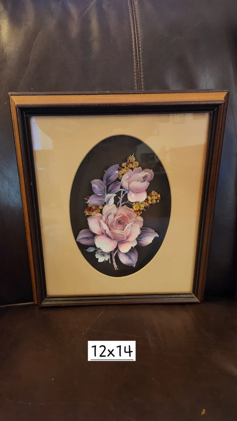 This set includes two framed decoupage wall art pieces. One features a detailed rose bouquet in an oval mat, measuring 12x14. The other showcases three birds on a blooming branch, measuring 12x21. Both pieces have wooden frames.