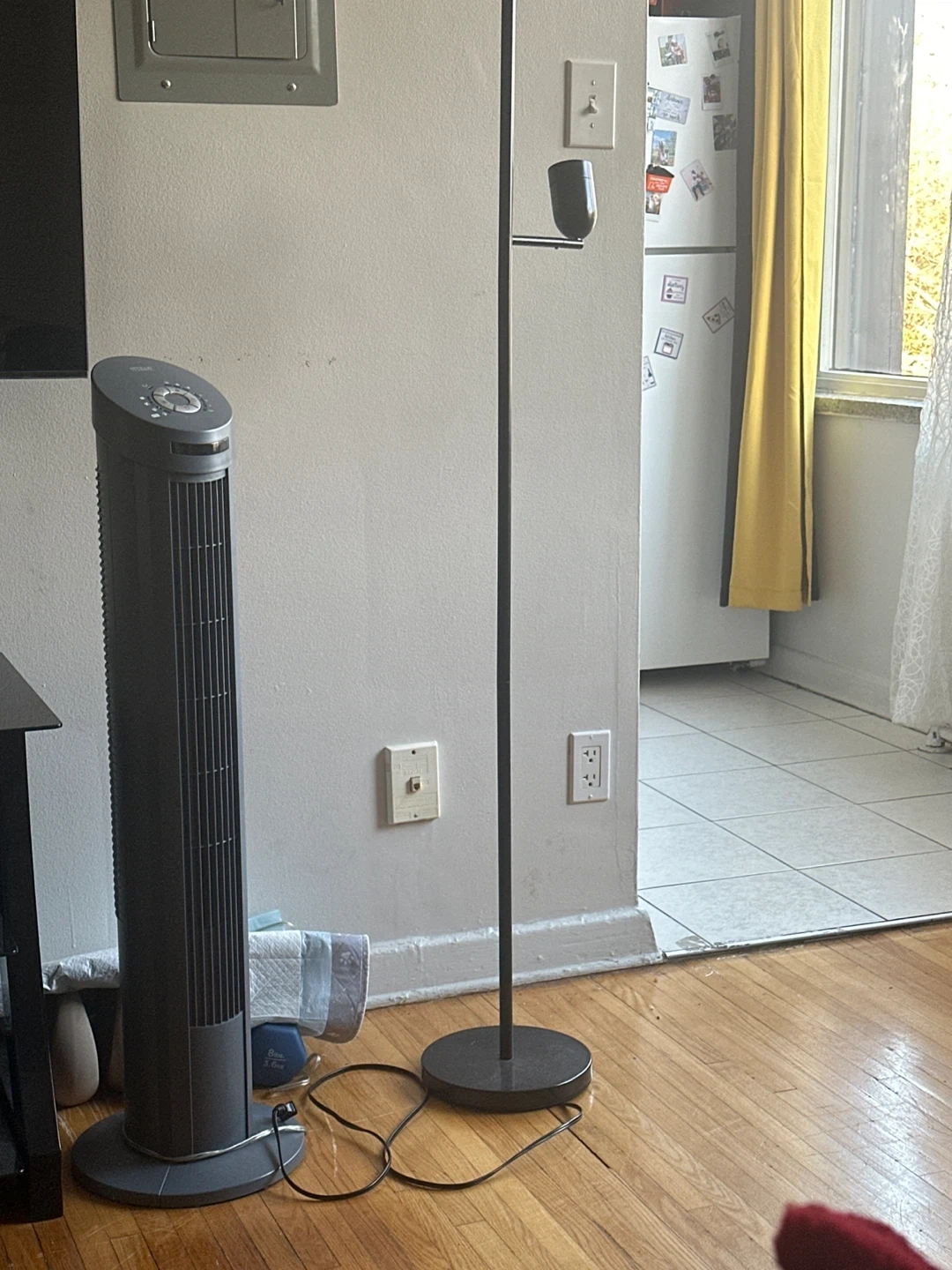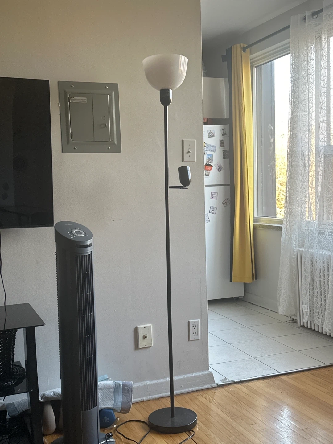 a floor lamp. It's in great condition and adds a modern touch to any room. The black finish is sleek and versatile, fitting well with various decor styles. Perfect for adding light and a small surface for your essentials beside your sofa or bed