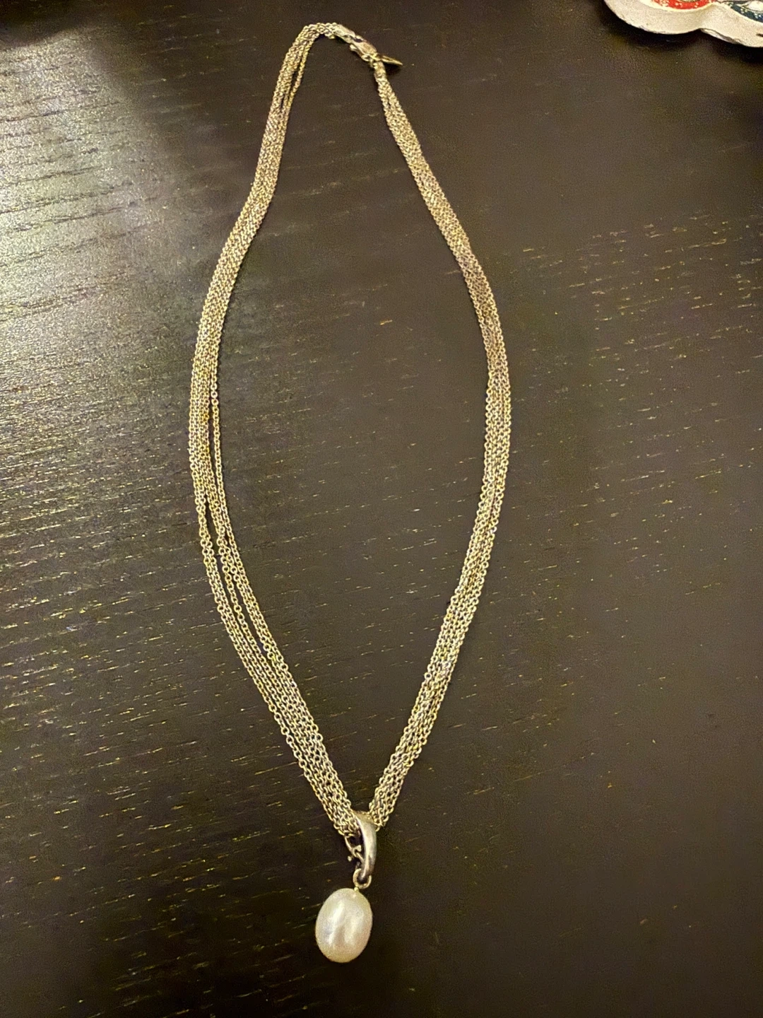 This necklace features multiple delicate silver chains layered together, culminating in a single pearl pendant. The clasp is a secure lobster claw style. Sterling silver.