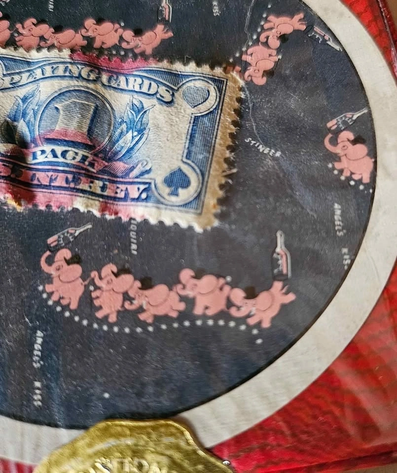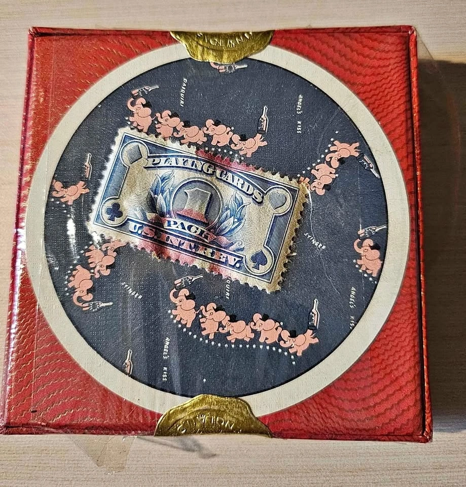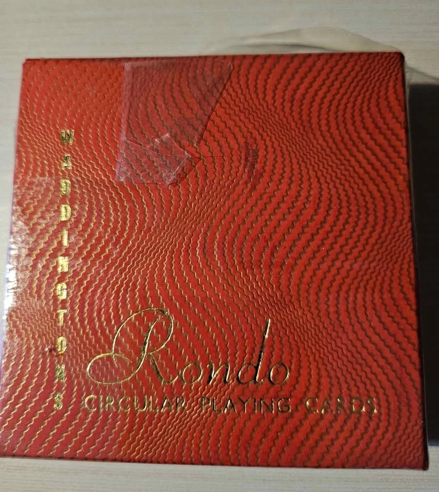 Unopened, new in box, vintage circular playing cards featuring drunk elephants in top hats. Waddingtons Rondo brand. Box is approximately 3" square. Cash accepted.
