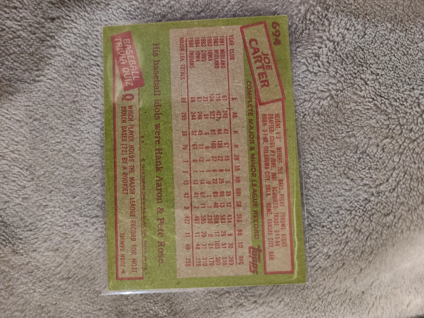 1985 Topps Baseball Card - Joe Carter Cleveland Indians #694