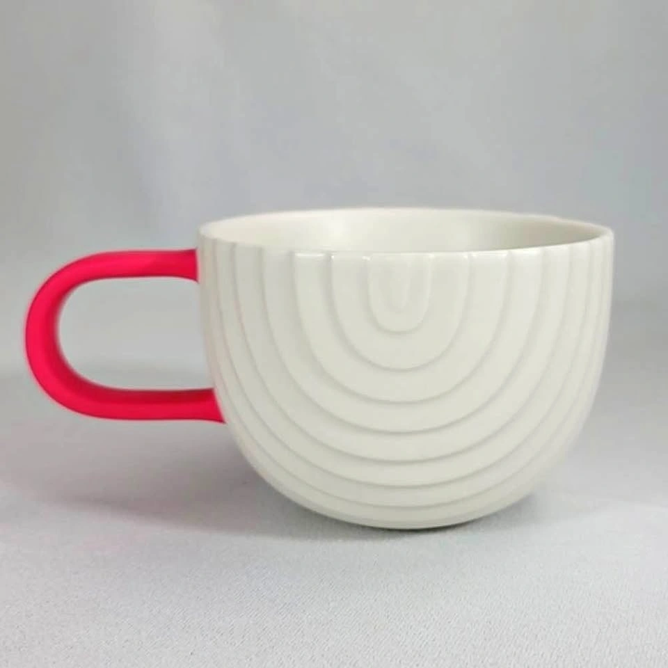 Rainbow coffee mug from Starbucks 2018 V-Day collection. Short shallow mug. In good condition - has a couple scratches on the pink handle and general signs of use on the bottom. Holds 12oz. Has a matte finish.
