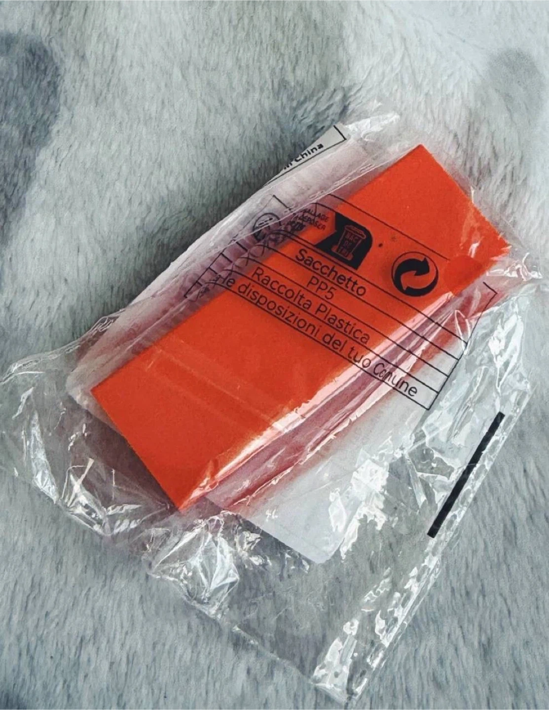 Orange cleaning eraser. Removes rust, stains, and other marks from various surfaces. Great for kitchen and bathroom cleaning.