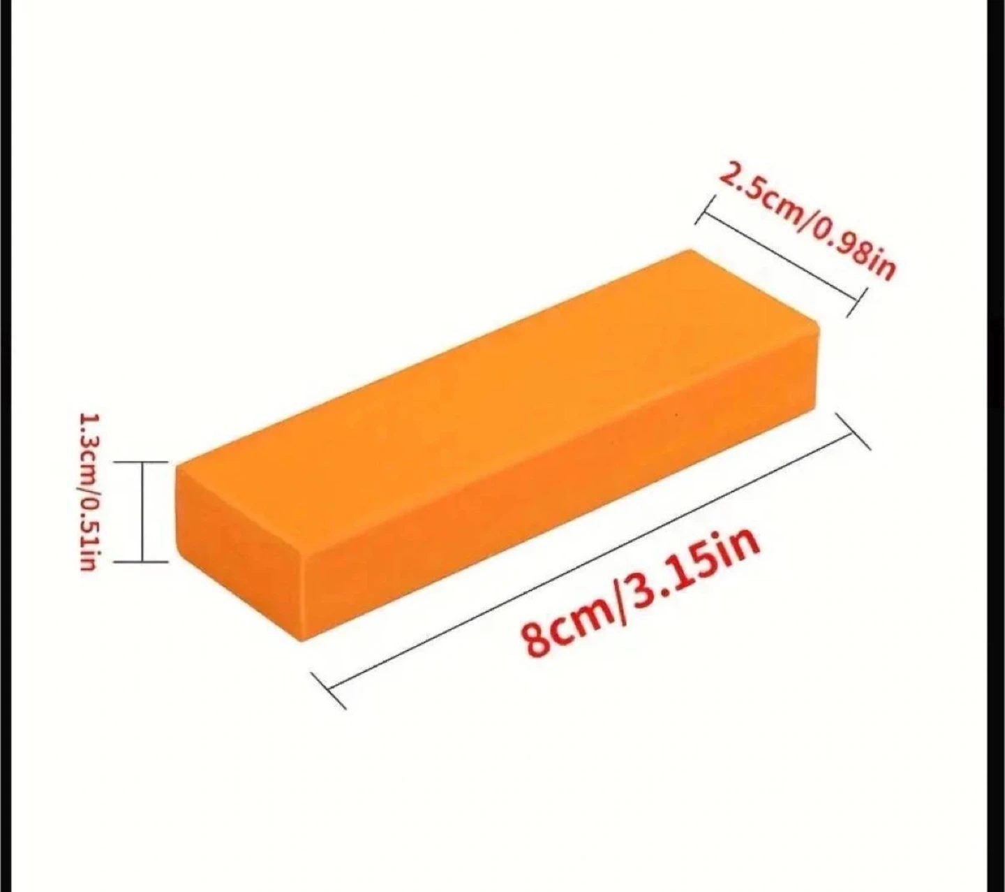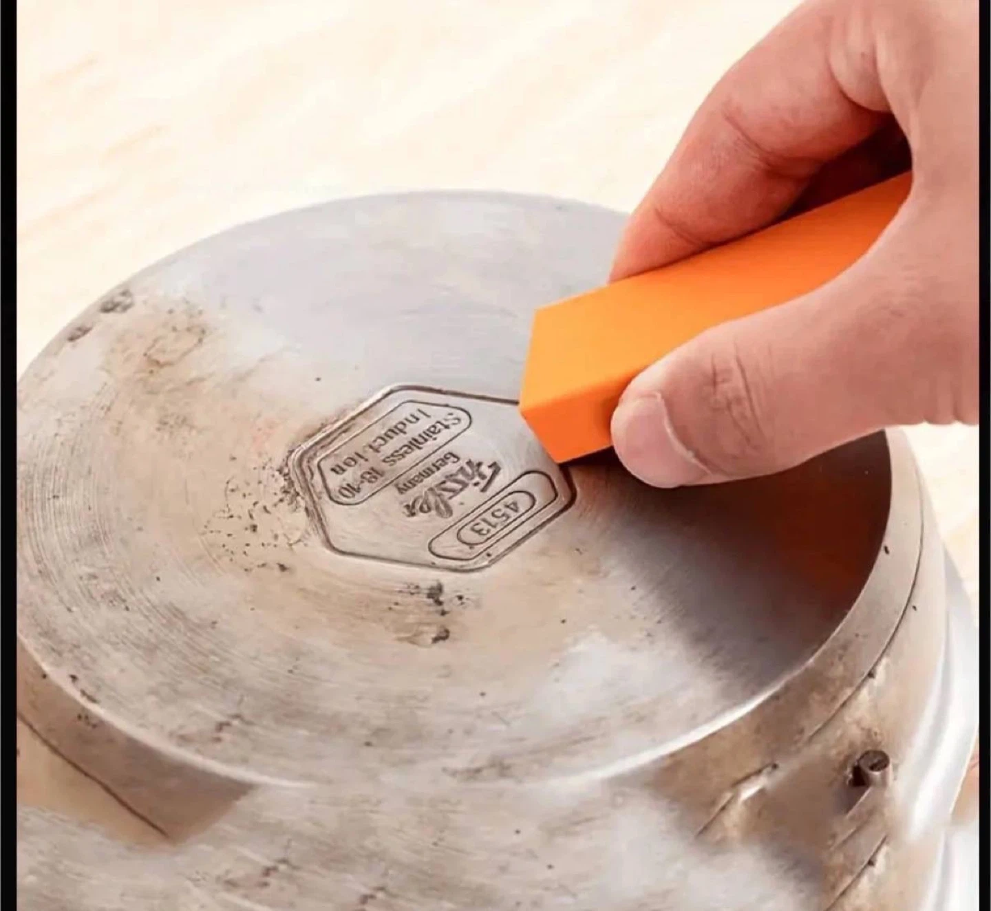 Orange cleaning eraser. Removes rust, stains, and other marks from various surfaces. Great for kitchen and bathroom cleaning.