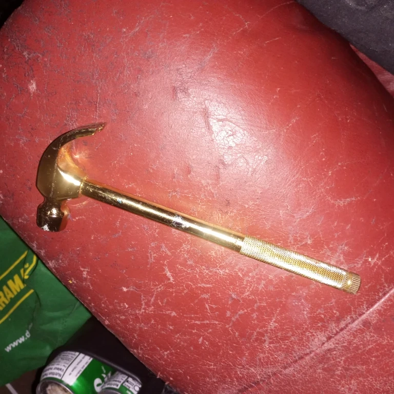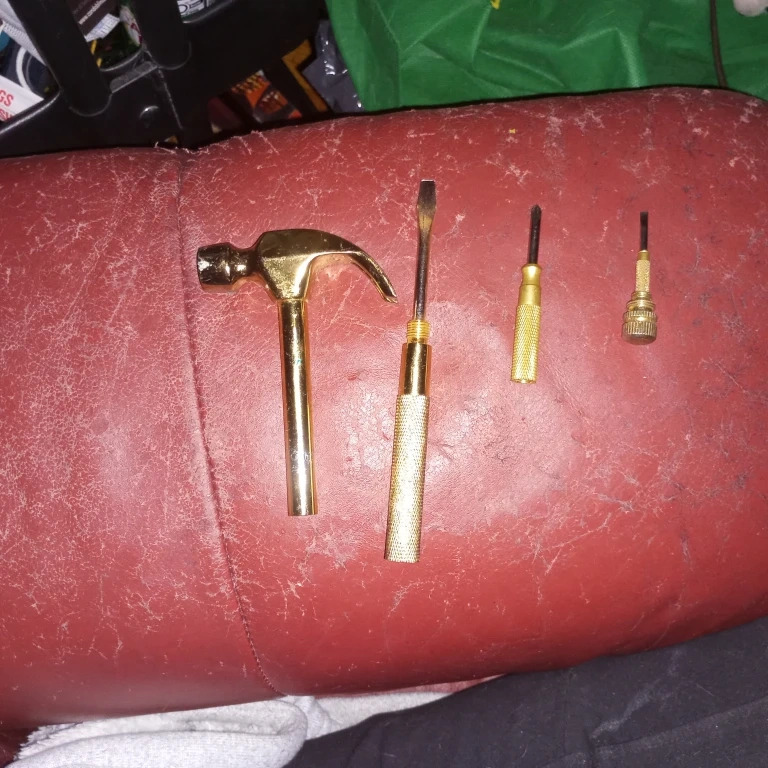 This vintage gold-coloured tool set includes a small hammer and three interchangeable screwdriver bits.