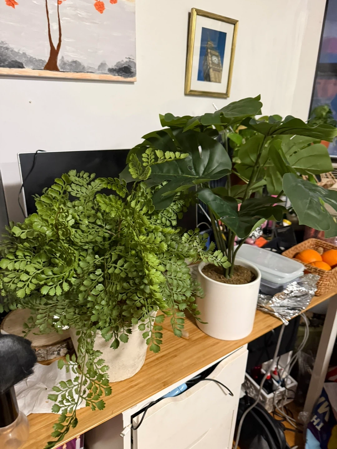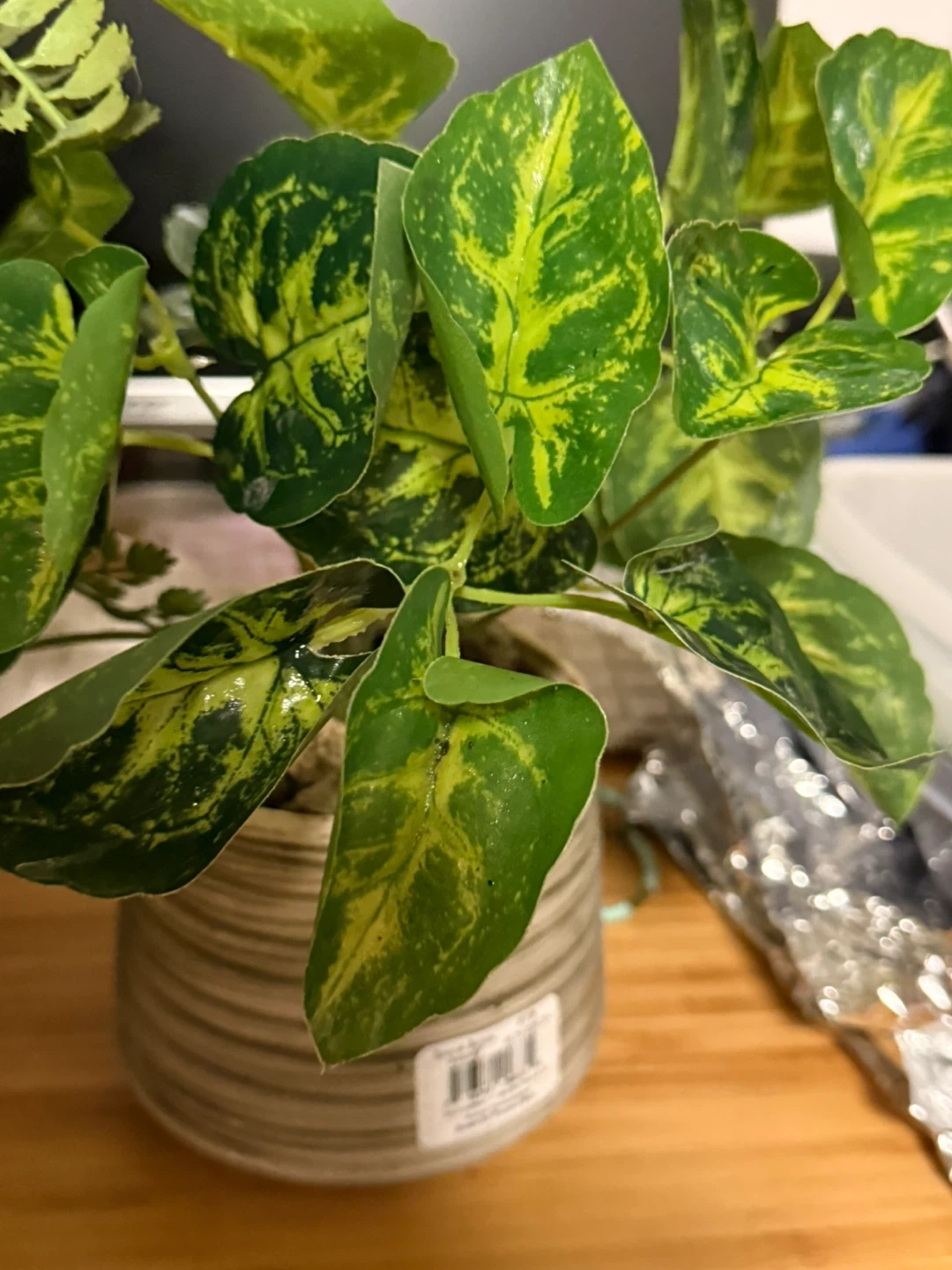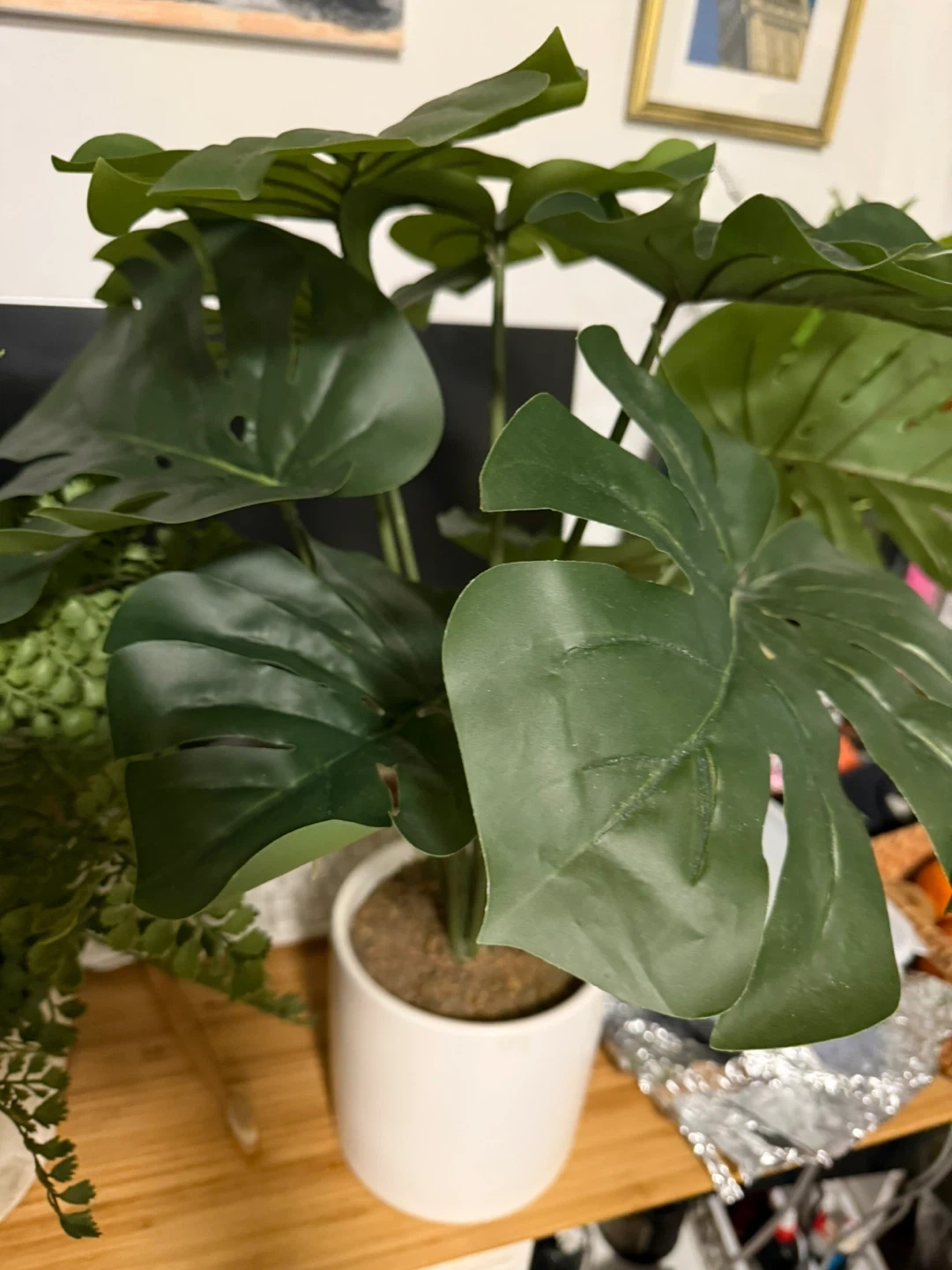 This artificial Monstera plant features realistic green leaves and comes in a simple white pot. It's a low-maintenance way to add greenery to any room. The pot is approximately 6 inches tall. 3for$25 or $10 each
