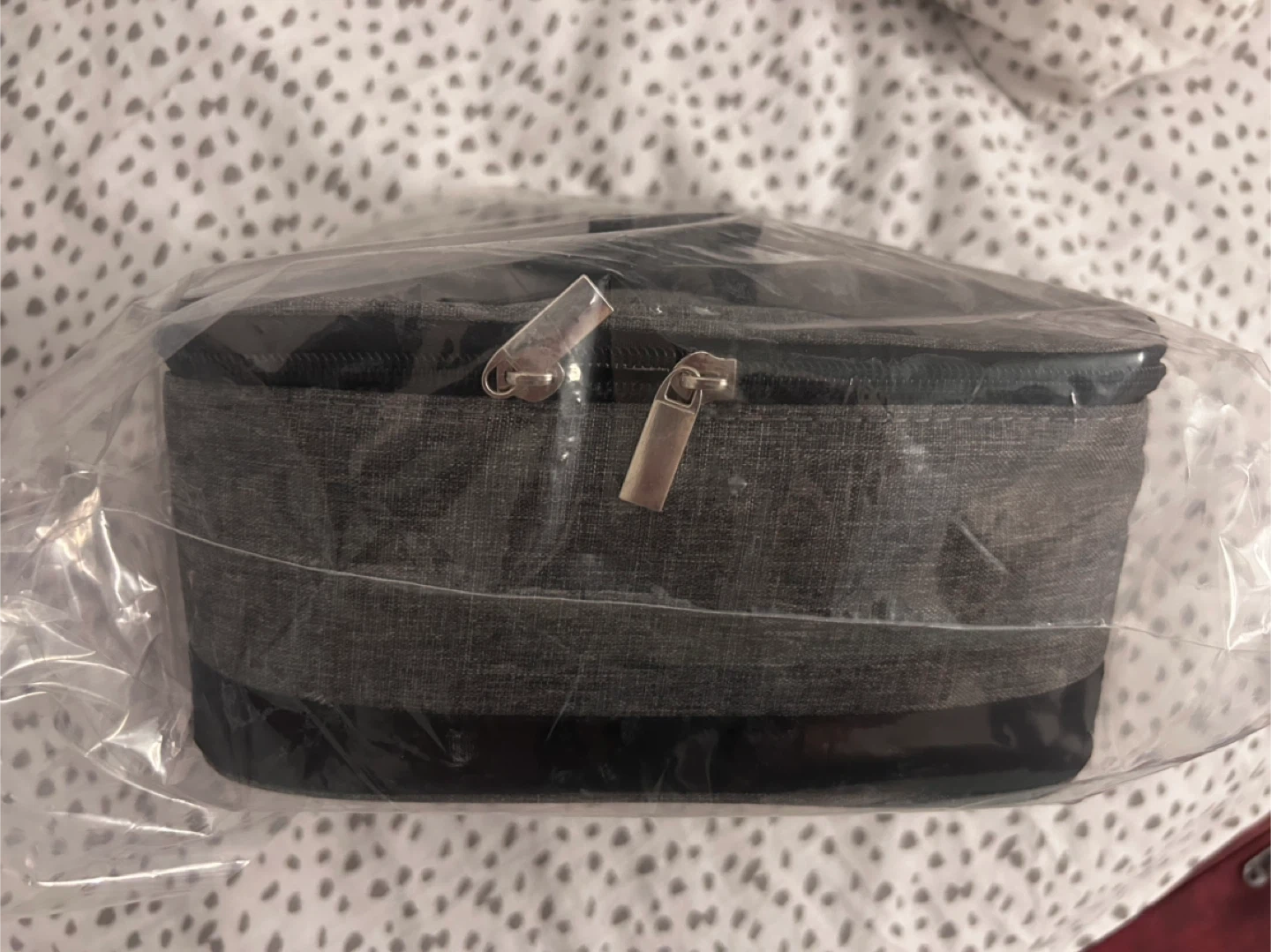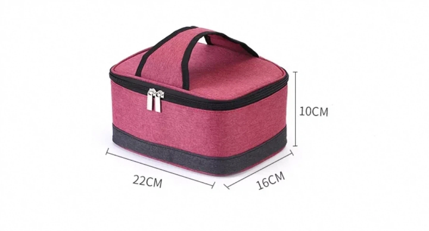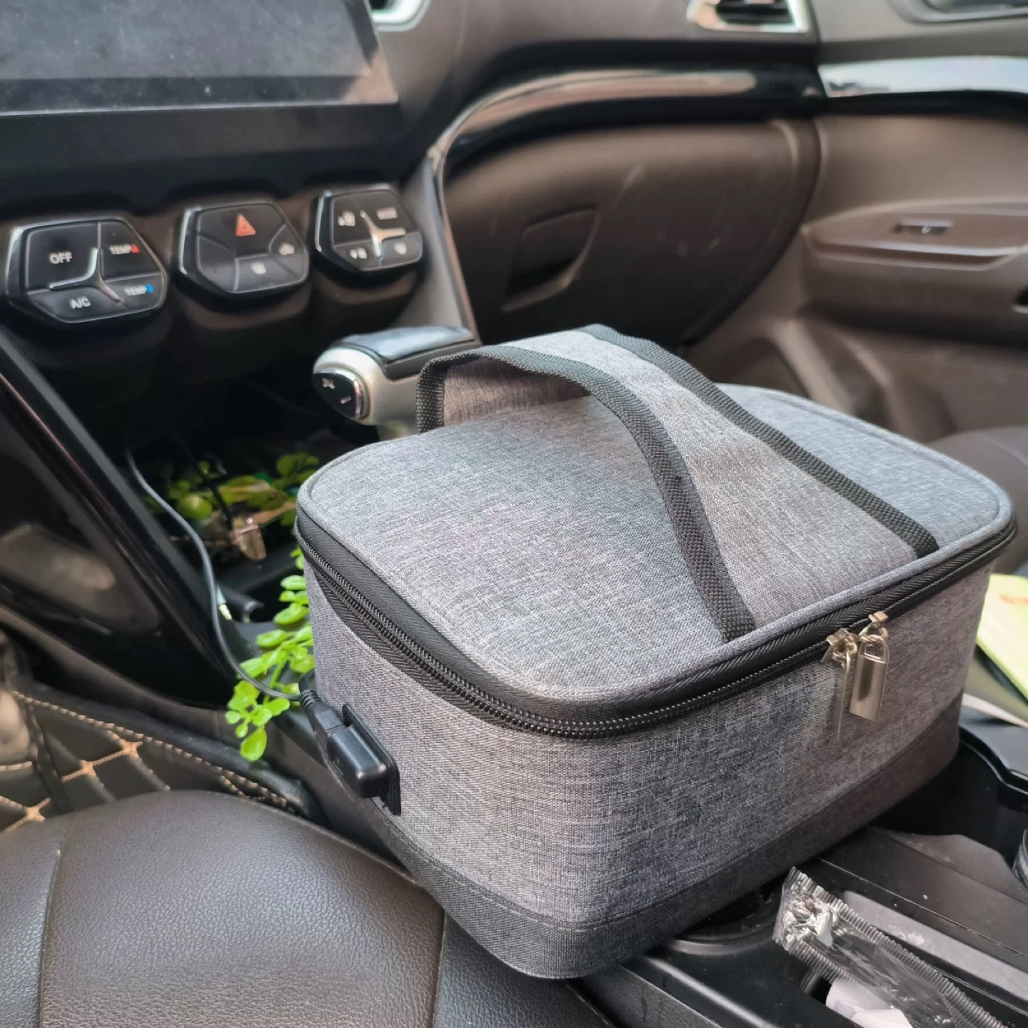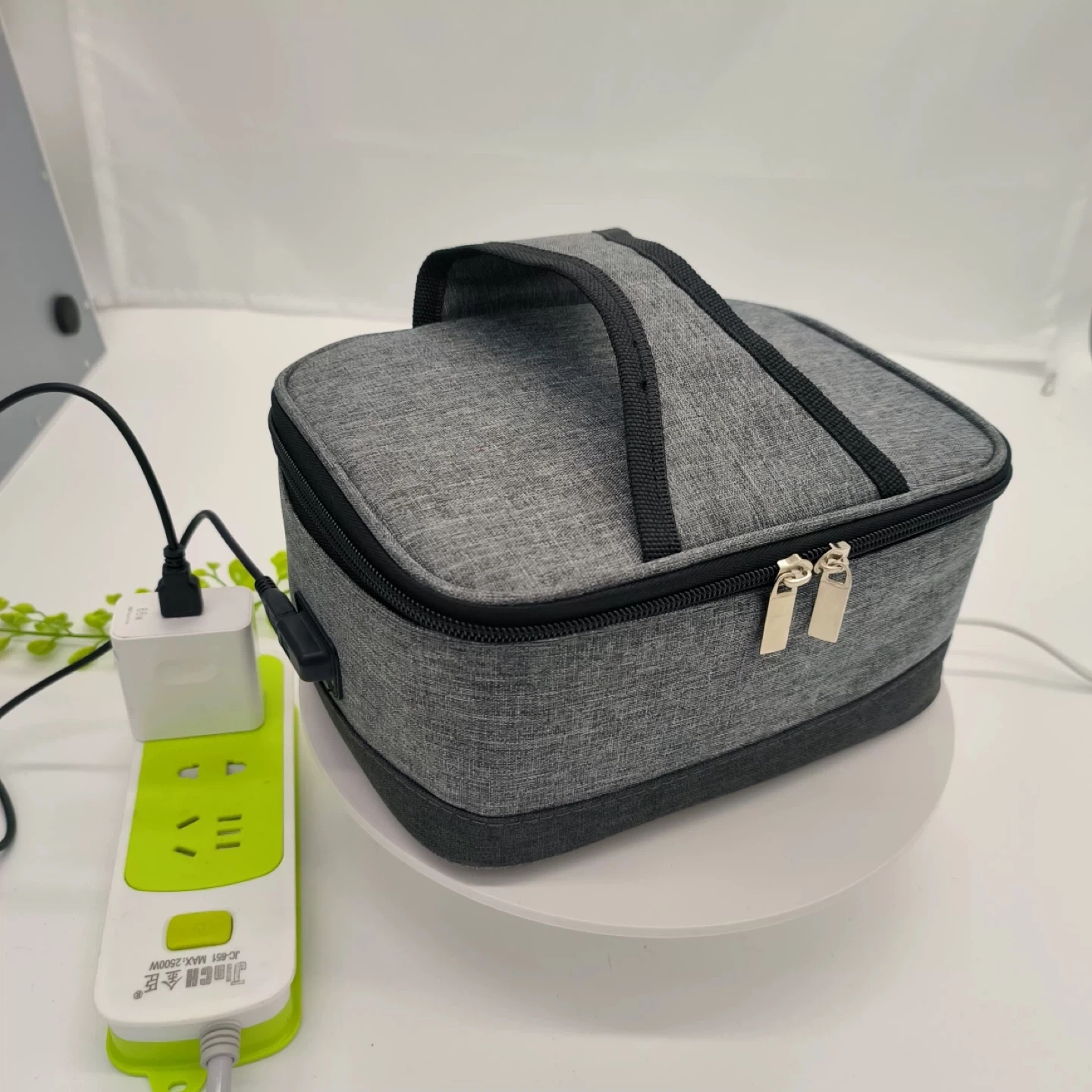 This is a grey insulated lunch bag that features USB heating. It's made of durable fabric with a sturdy handle and zippered closure. The bag is compact and portable, great for keeping your meals warm on the go.