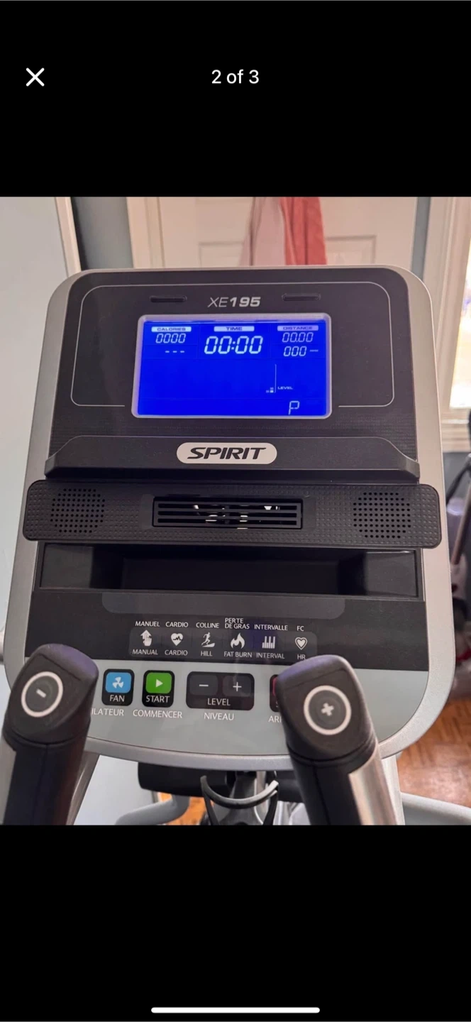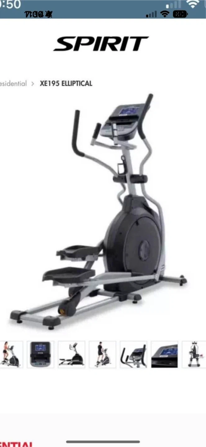 Spirit XE195 elliptical machine for home workouts. It has multiple program options and adjustable resistance levels. This machine is great for cardiovascular fitness at home!