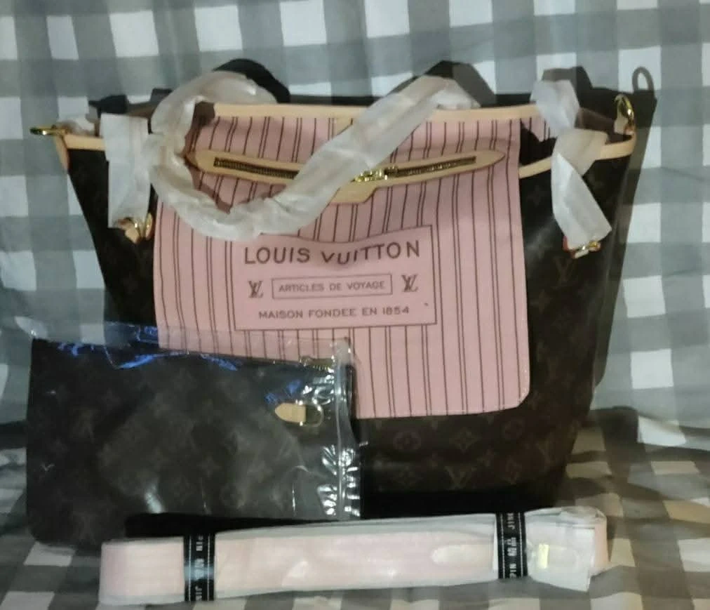 This Louis Vuitton tote bag comes with a matching pouch. It's made from the iconic monogram canvas with a pink striped interior. Includes adjustable strap.