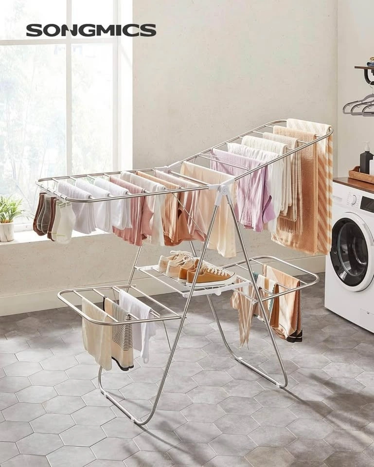 Brand new SONGMICS clothes drying rack, still new in the box. Perfect for air-drying clothes indoors or outdoors. This free-standing rack has a 2-level foldable design, height-adjustable wings, and plenty of space for clothes, towels, and socks. Folds flat for easy storage. Great for apartments, houses, or anyone who wants to save energy and keep clothes in great condition.