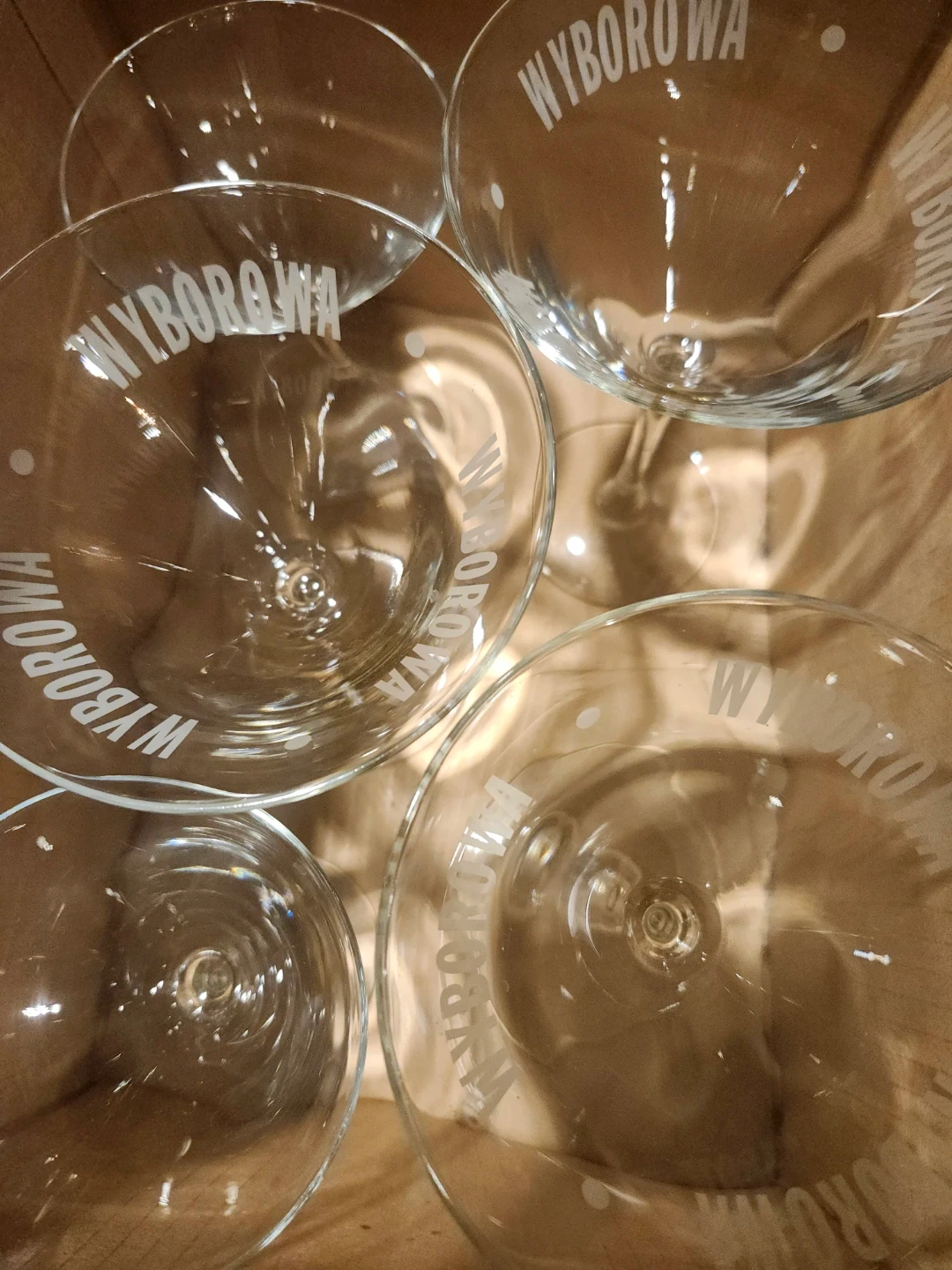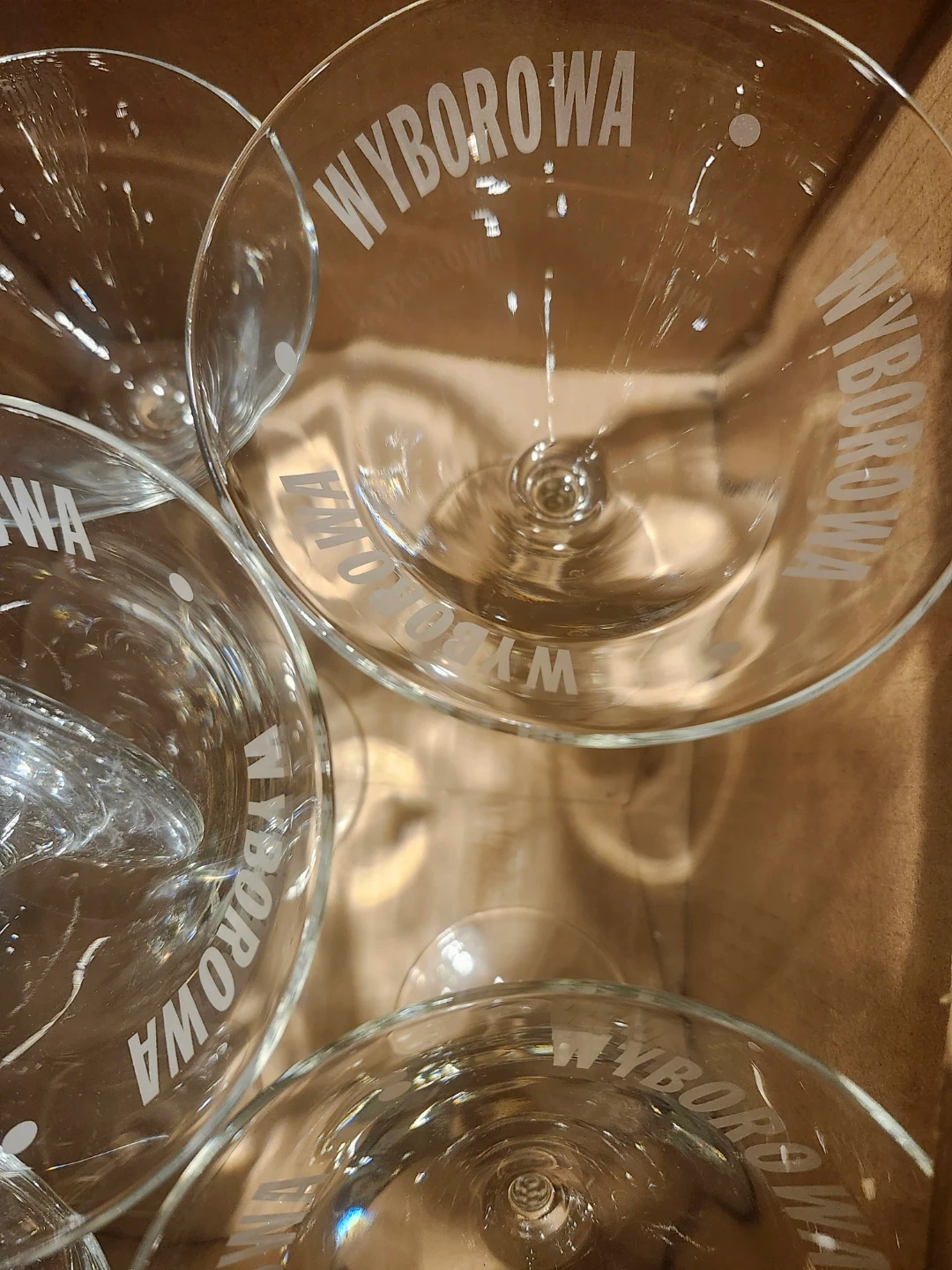A set of 8 assorted clear martini glasses 3 with 'Wyborowa' branding. These glasses have a classic shape with a slender stem. Perfect for serving cocktails!