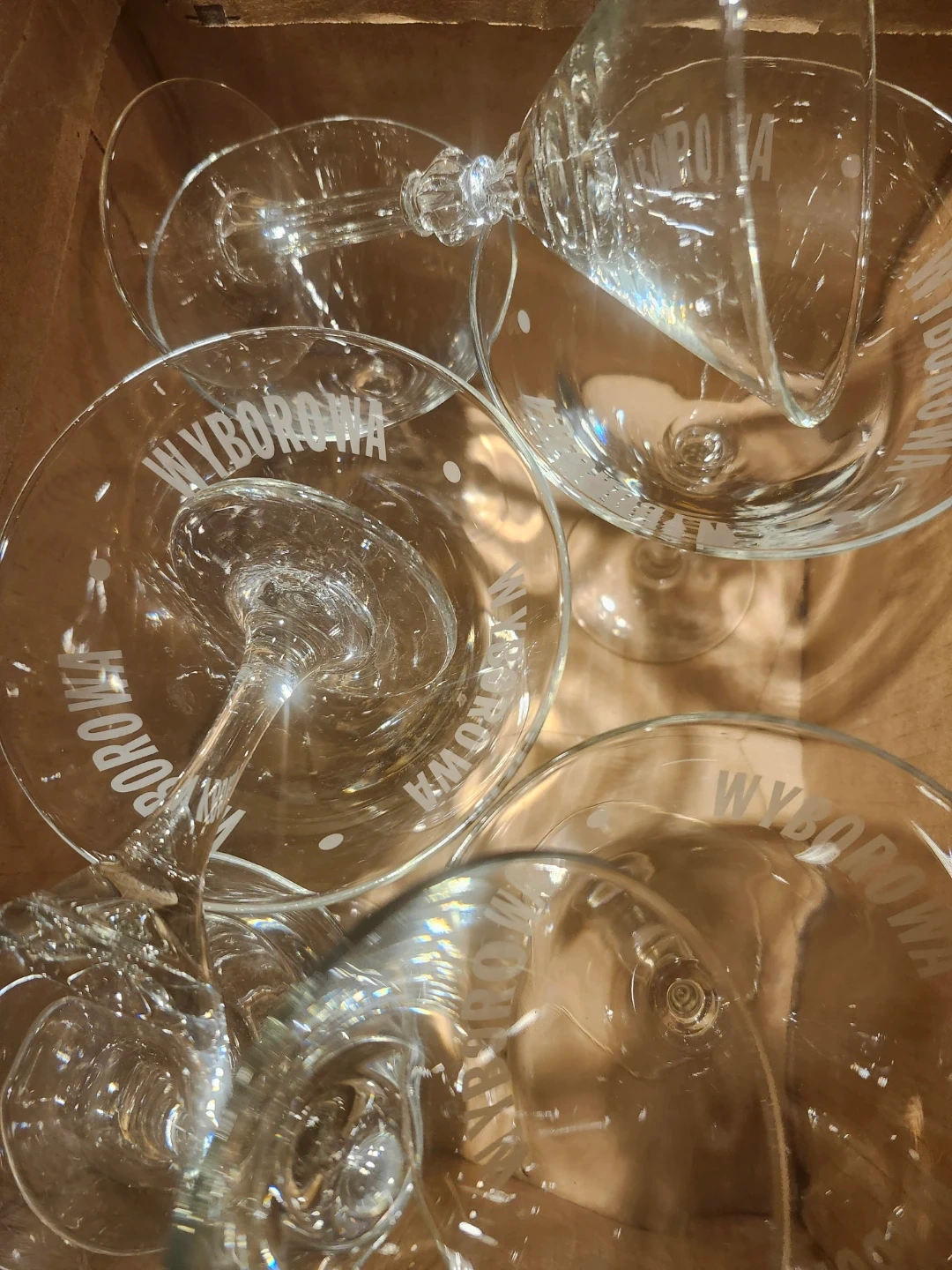 A set of 8 assorted clear martini glasses 3 with 'Wyborowa' branding. These glasses have a classic shape with a slender stem. Perfect for serving cocktails!
