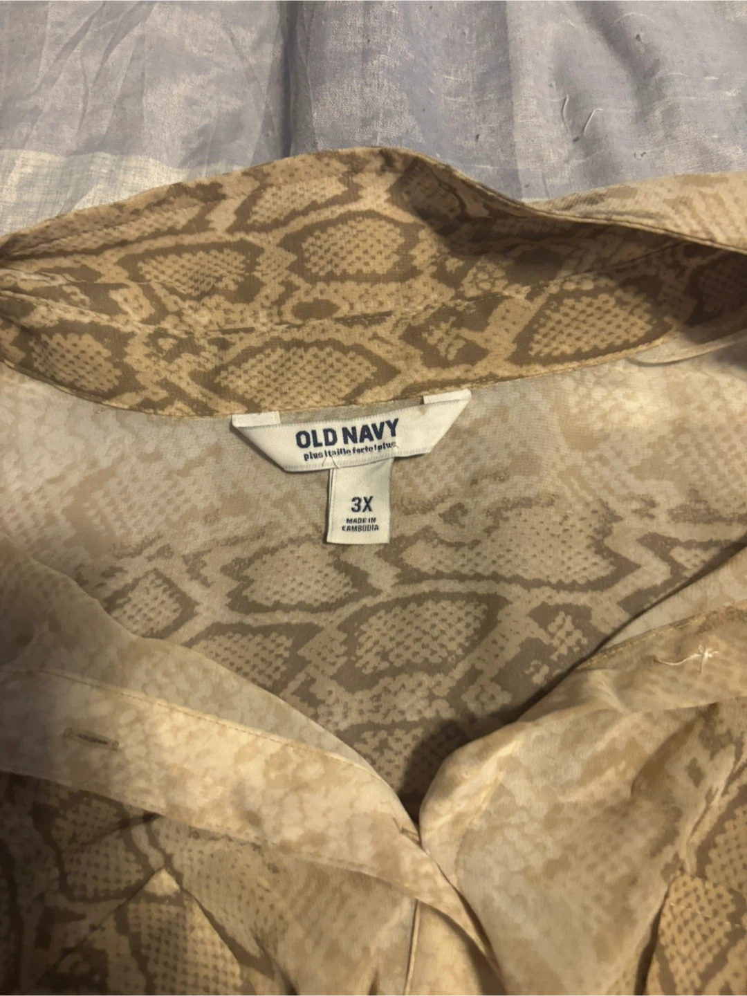 Old Navy women's collared button-up shirt in a beige snake print. It's a size 3X. The fabric is lightweight and sheer.