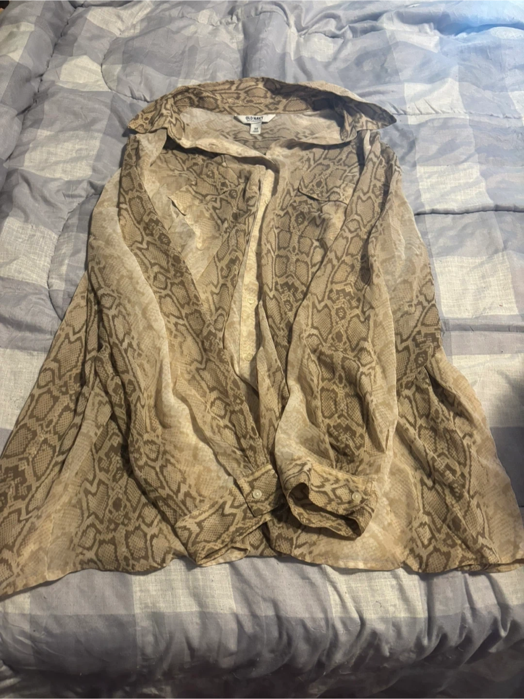 Old Navy women's collared button-up shirt in a beige snake print. It's a size 3X. The fabric is lightweight and sheer.