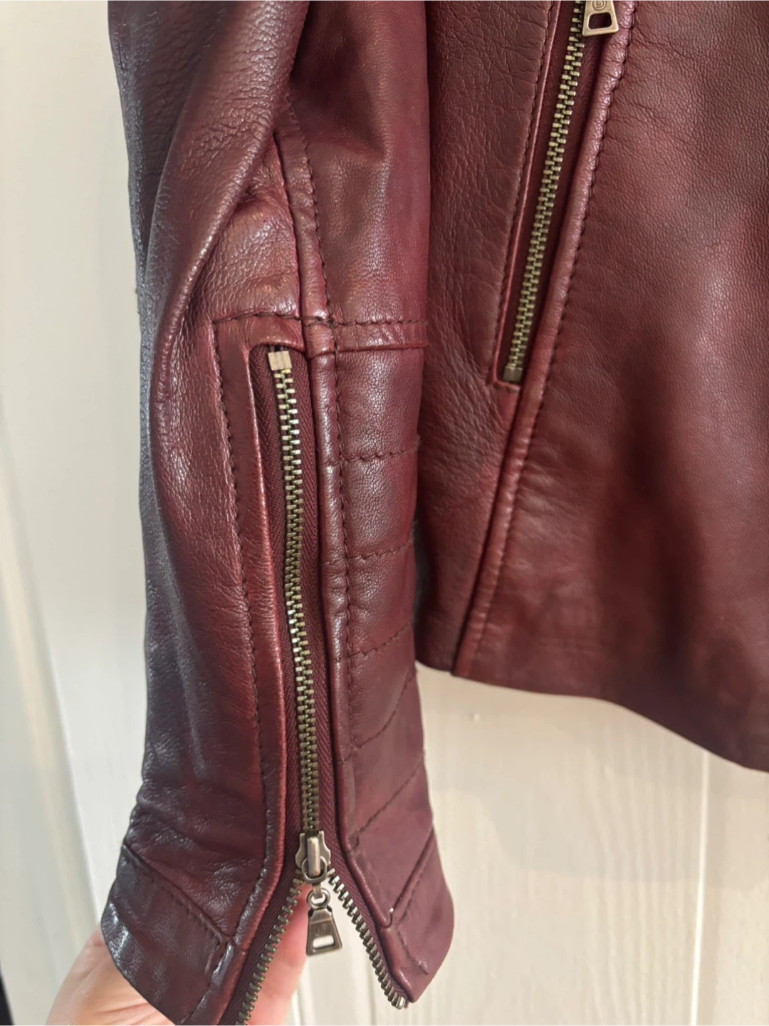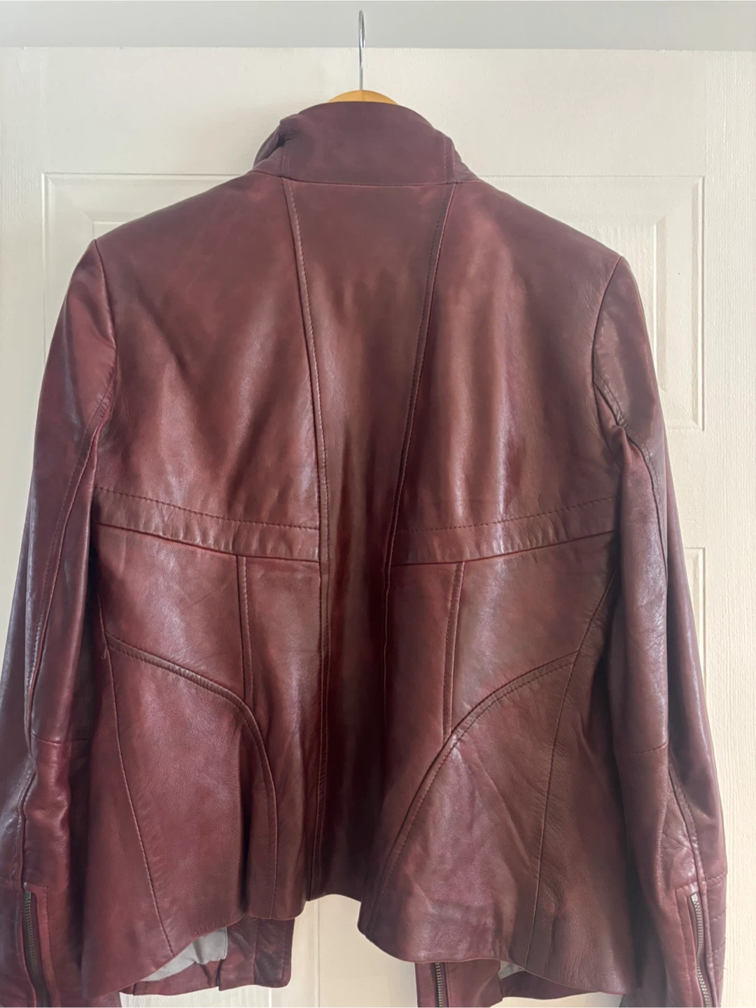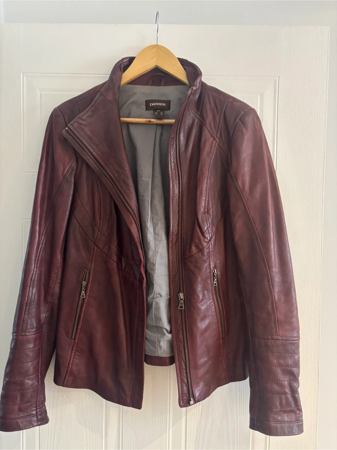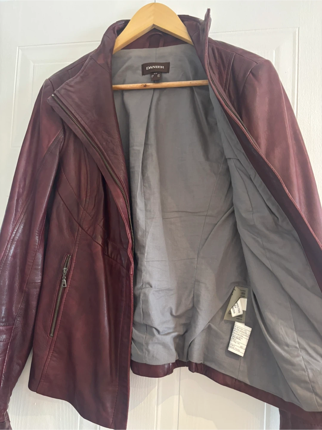 This is a DANIER leather jacket. It's a size Small.The jacket is made of mauve Color leather with a grey lining.