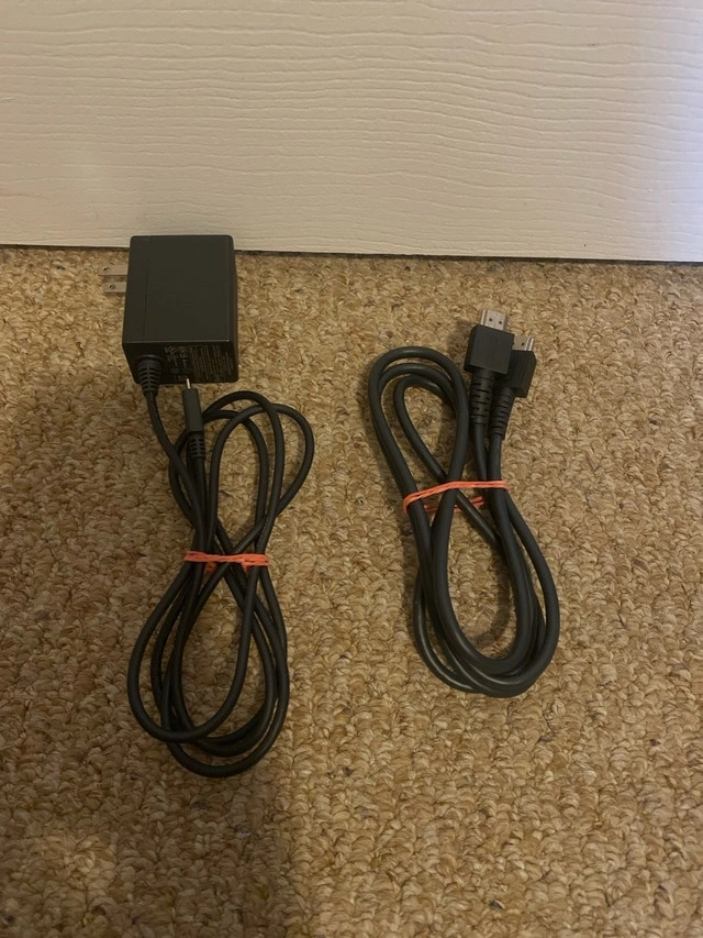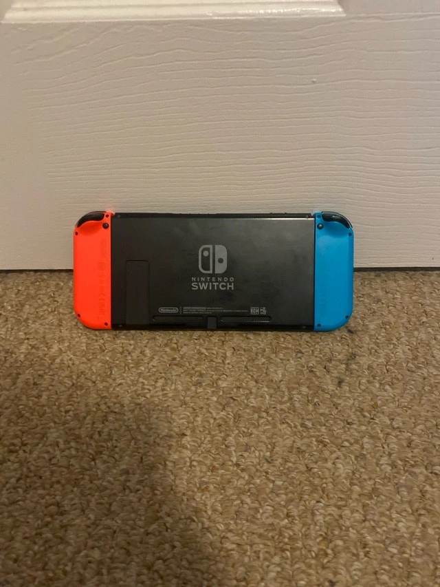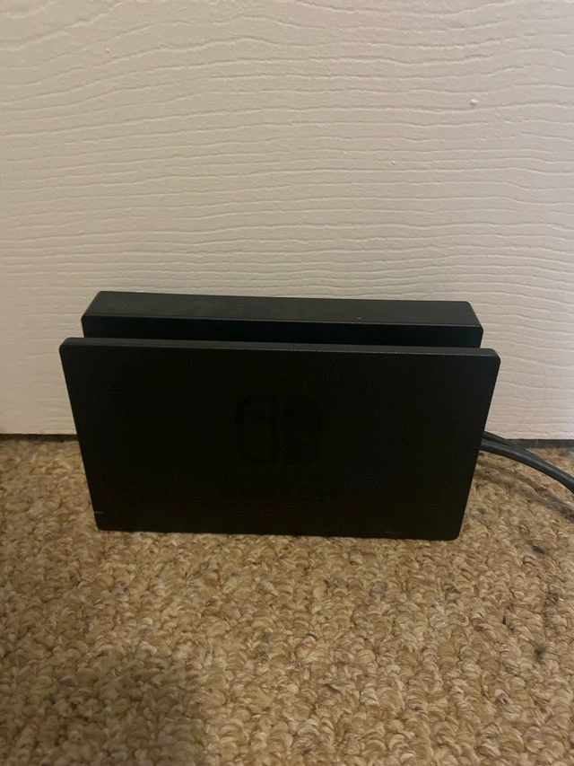 Nintendo Switch console with Joy-Cons, Dock, Joy-Con grip, original AC and HDMI cords. Includes Just Dance 2022. There are little scratches on the screen, and the right Joy-Con slides out easily. Cash and cashless payments are accepted. Available for curbside pickup.