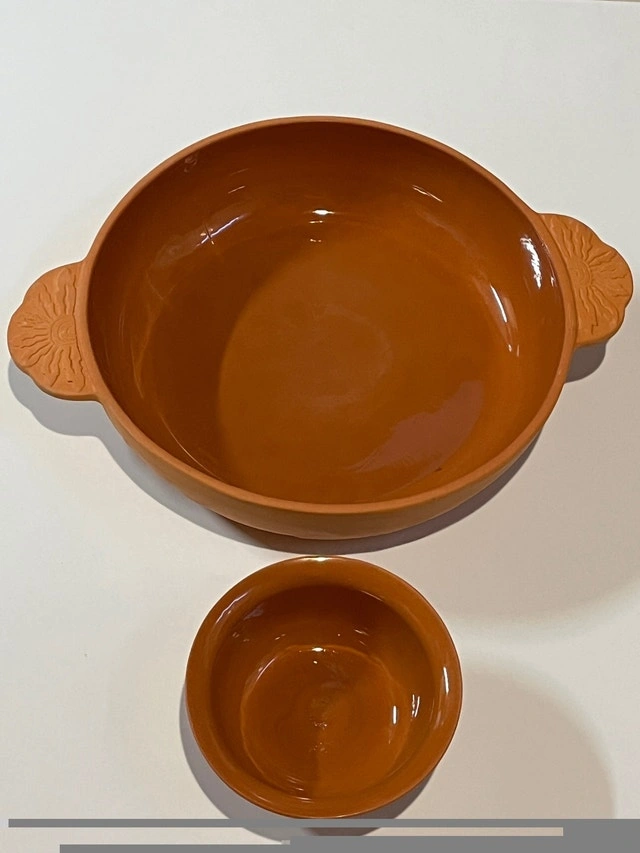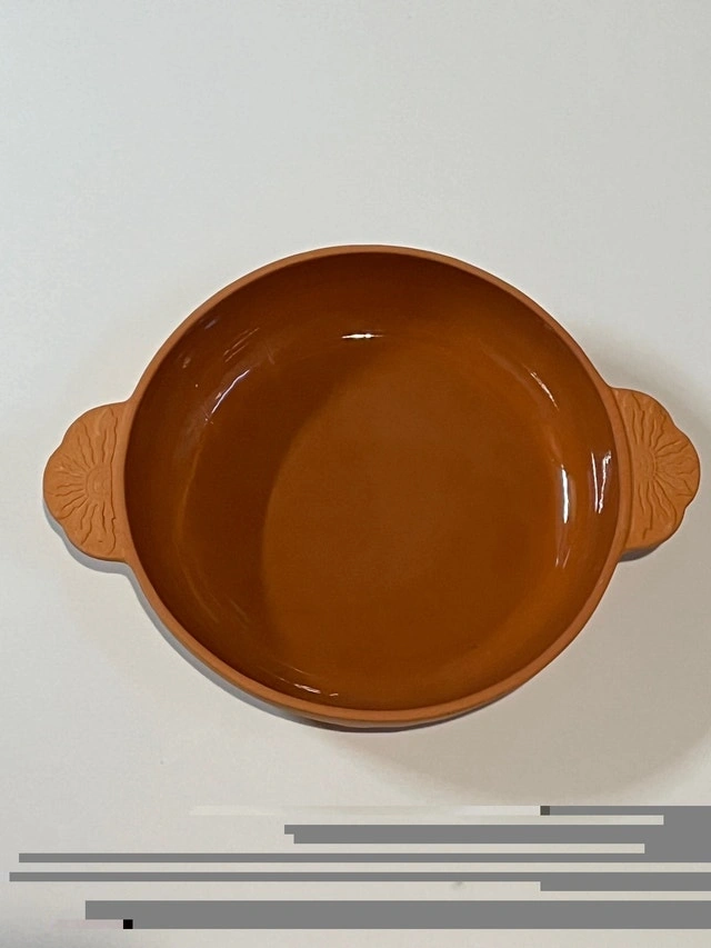 The large bowl is slightly oval and approximately 11.25 inches wide and 2.5 inches deep. Outside measurement from handle to handle is approximately 15 inches.