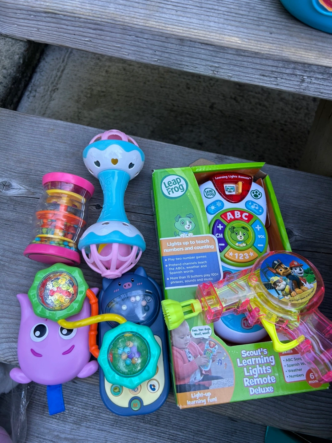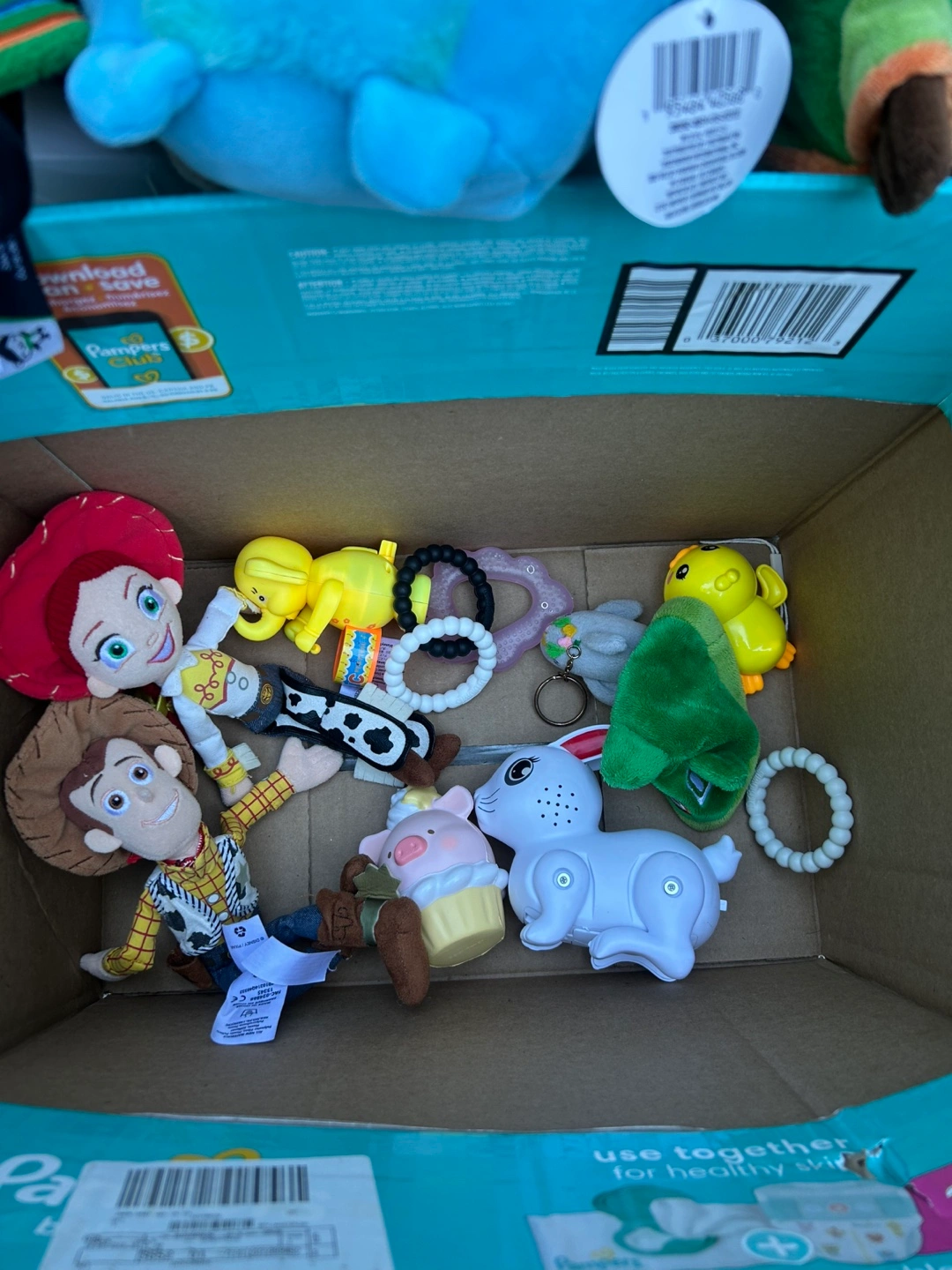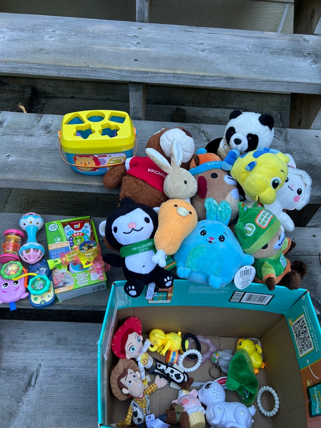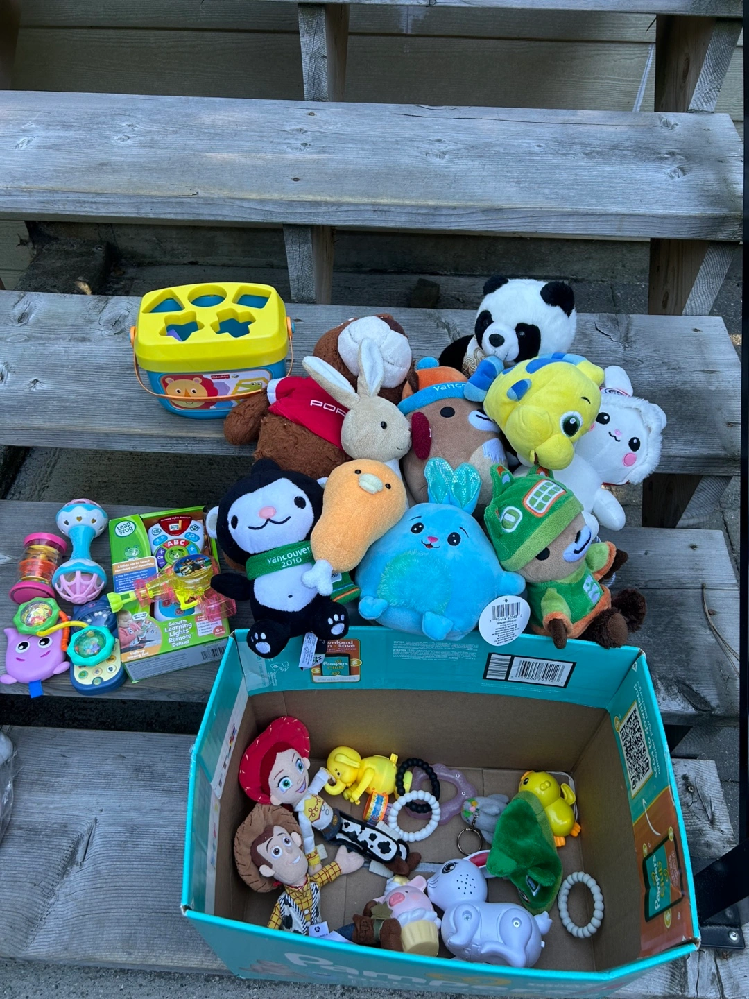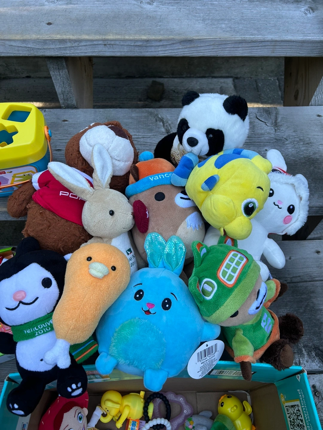 Selling a collection of kids' plush toys and a shape sorter. There are various characters and animals, perfect for little ones to play with and cuddle. Also included is a shape sorter for early learning fun!