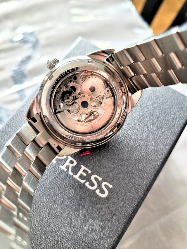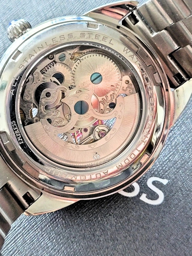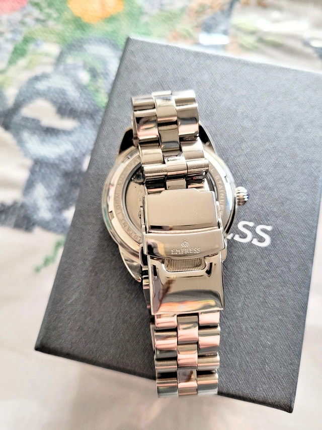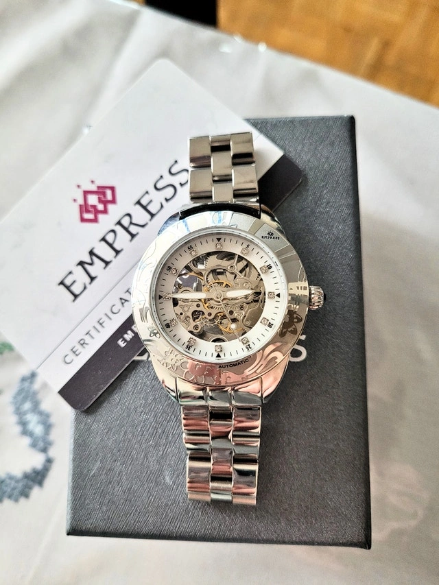 Brand new in the box with authenticity card. Retail value $995. Features a 316L surgical-quality stainless steel case, jeweled automatic movement with 19 jewels and 36-hour power reserve, beating at 21600 BPH. It has a sapphire-coated mineral crystal, MOP skeleton dial, and observation caseback. The crown is jewel-tipped. The bracelet is 316L surgical-quality stainless steel. Case diameter is 38mm. Water resistant to 30M. Cash accepted. Curbside pickup available.