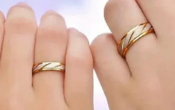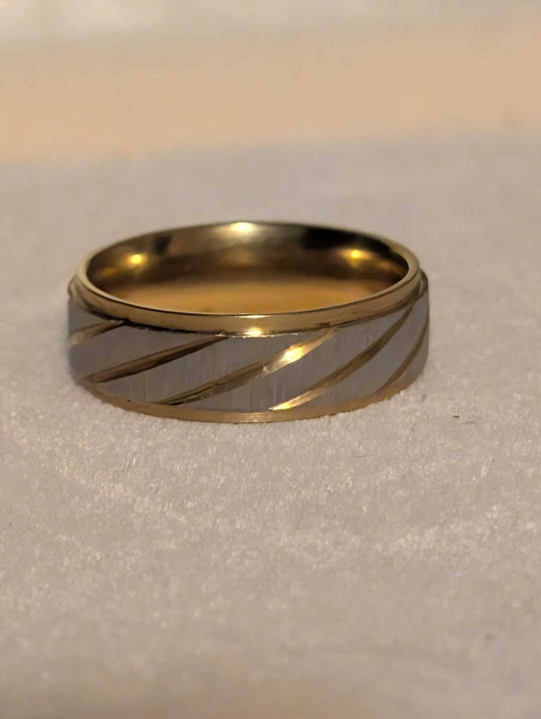 Stylish gold tone ring with a silver inlay. It features a unique diagonal pattern. Available in multiple sizes.