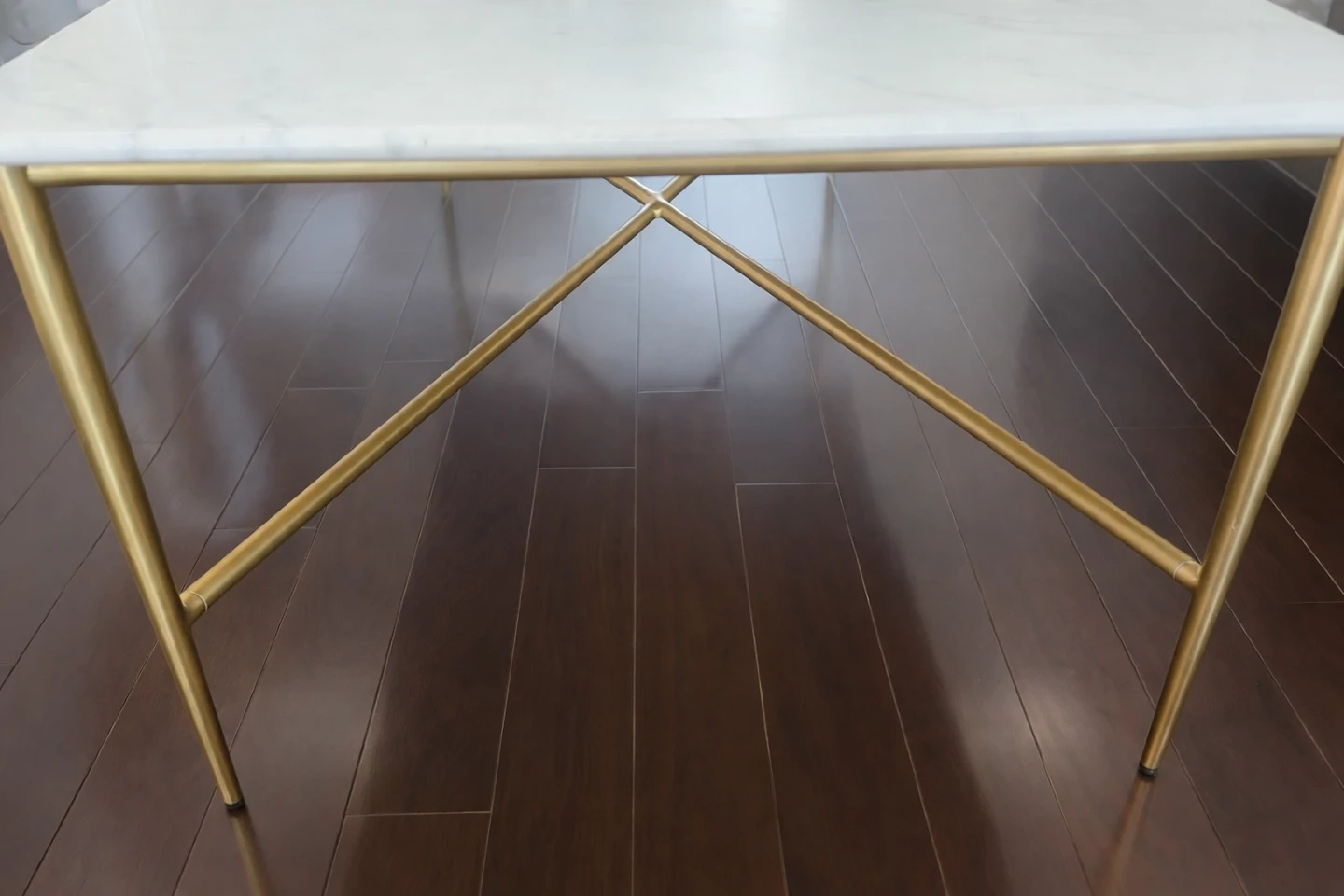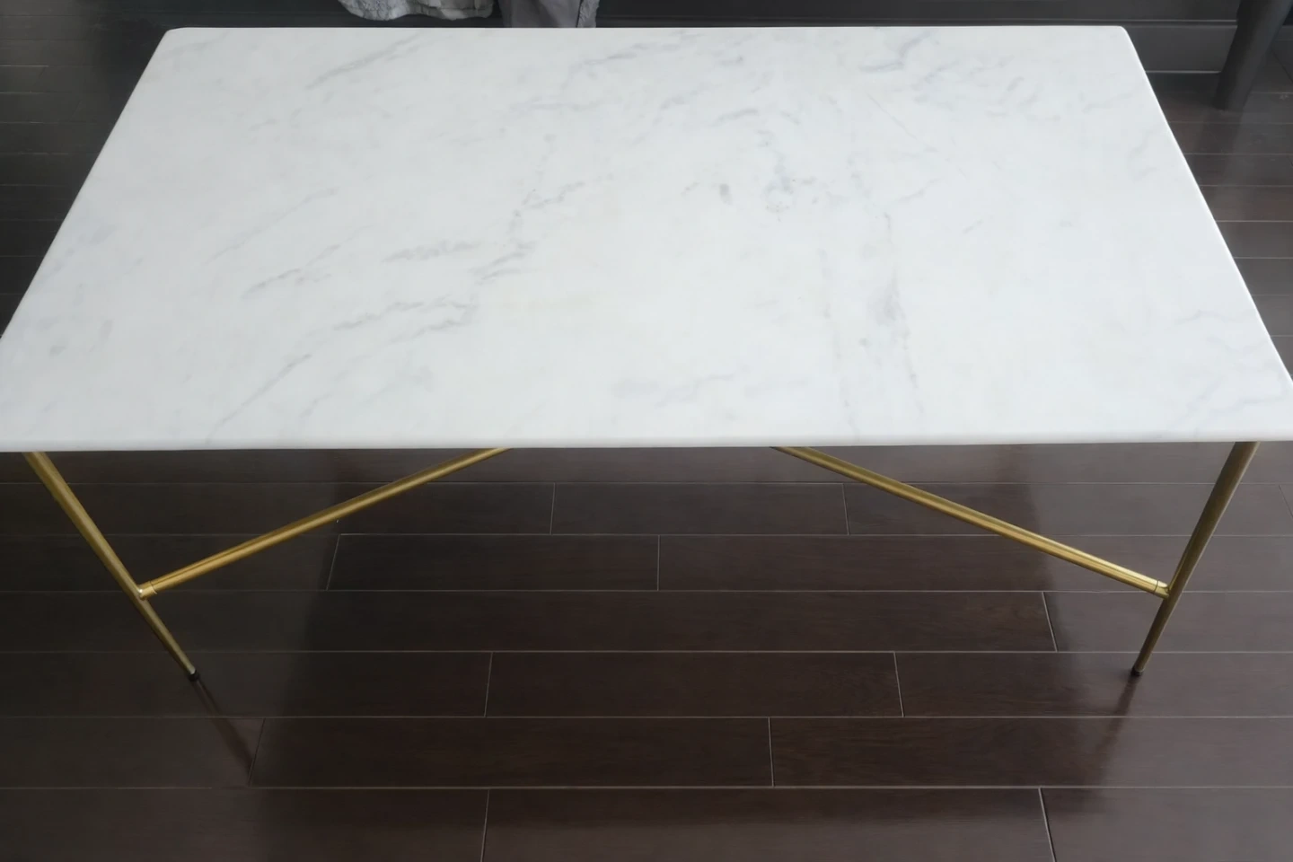Stylish coffee table from West Elm with a white marble top and a modern gold metal base. Made in India. It's perfect for adding a touch of elegance to your living room. The table's dimensions are 48 inches long, 24.5 inches wide, and 16 inches tall. Great for placing drinks, books, or decorative items.