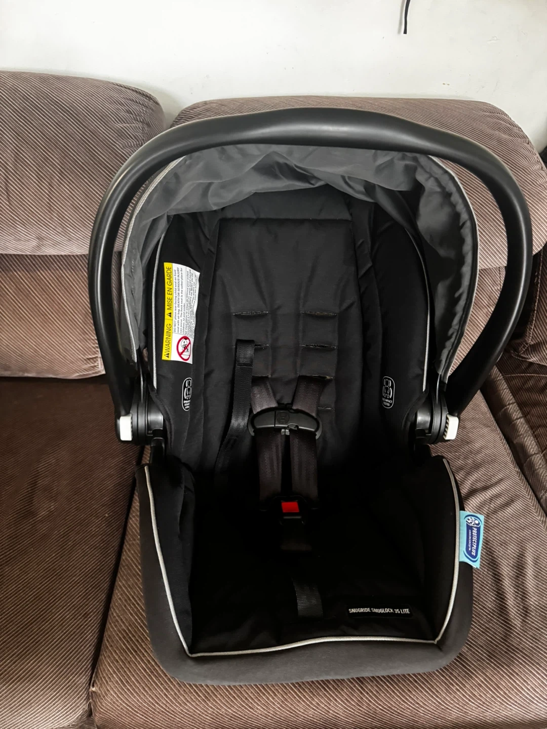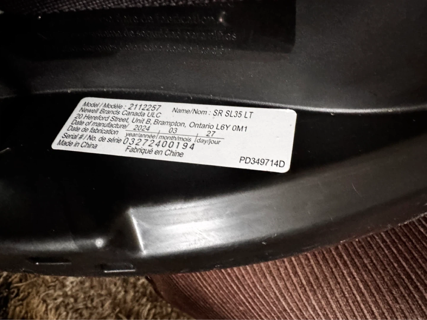 Infant car seat with a black colour. Manufactured in March 2024. It's a Newell Brands SR SL35 LT model. Safety tested and ready for a new family!