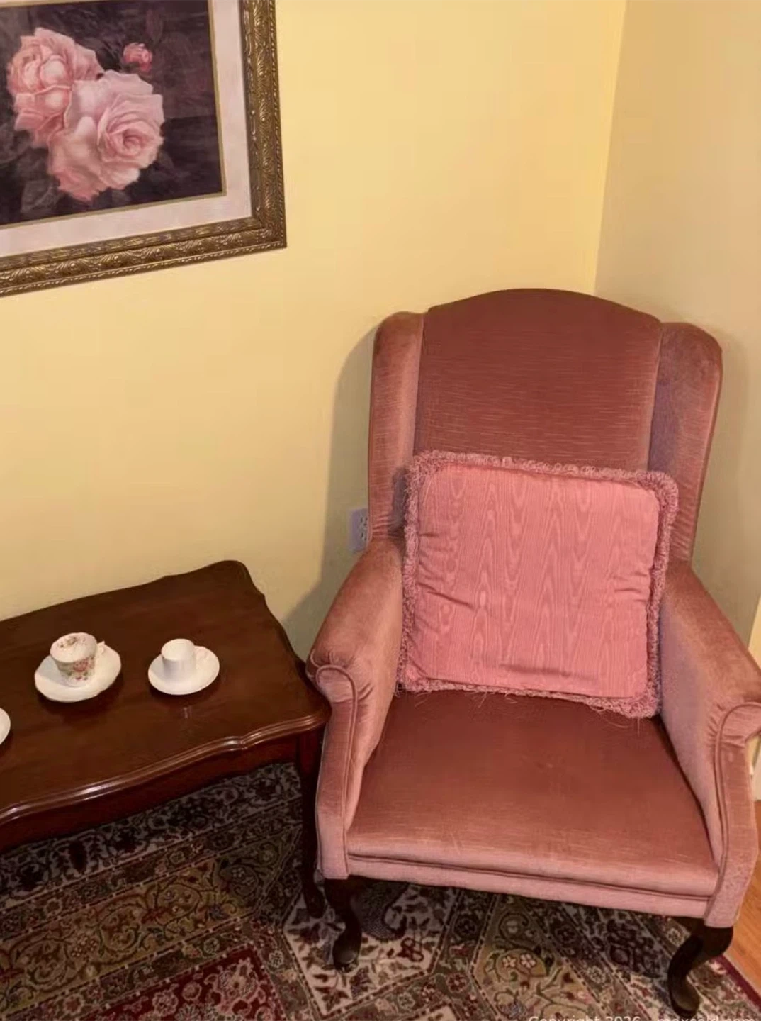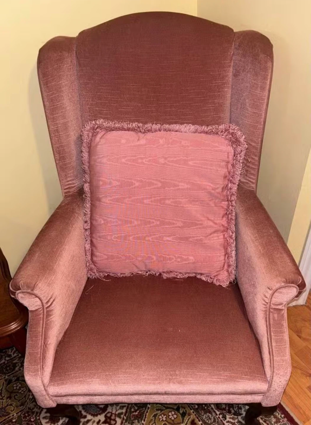 A lovely velvet wingback armchair in a rose colour. It comes with a matching decorative throw pillow. The chair has a classic design that'll add a touch of elegance to any room. Some minor staining present on the back of the chair.
