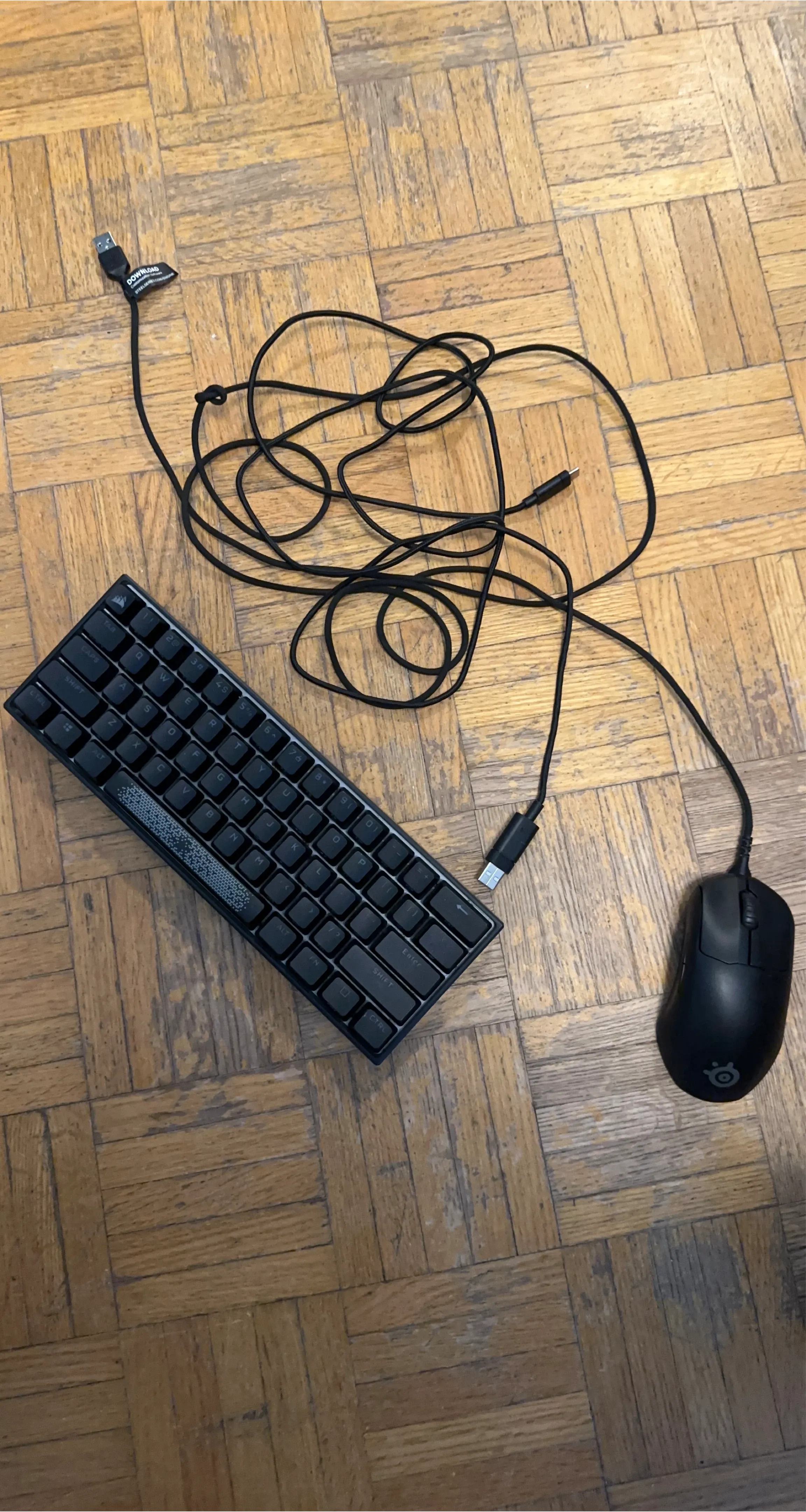 Black SteelSeries gaming keyboard and mouse. Both items are wired and connect via USB. Great for gaming setups!