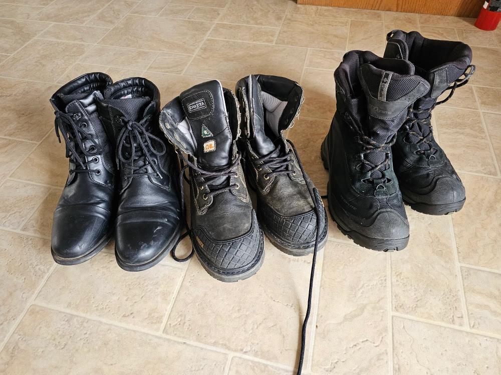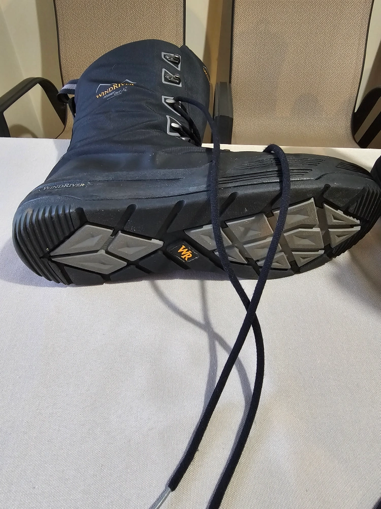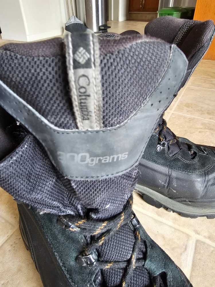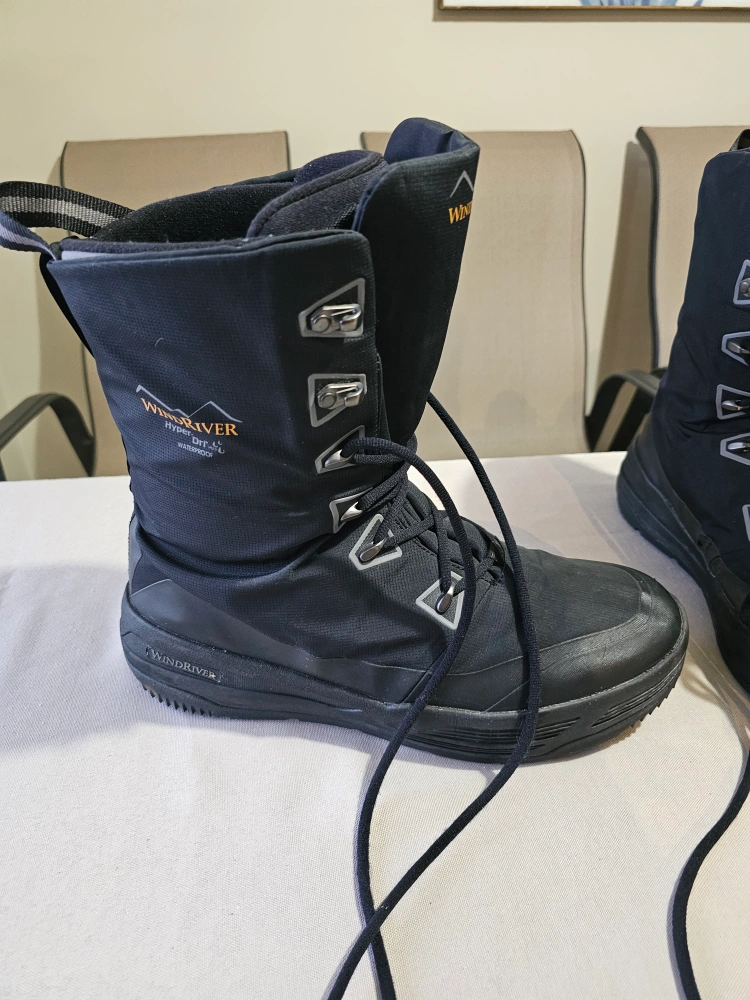 all shoes and boots are leather except the winter boots that are windriver. those are rated to -30 and those are $40. the Columbia are 30. the others are 20.