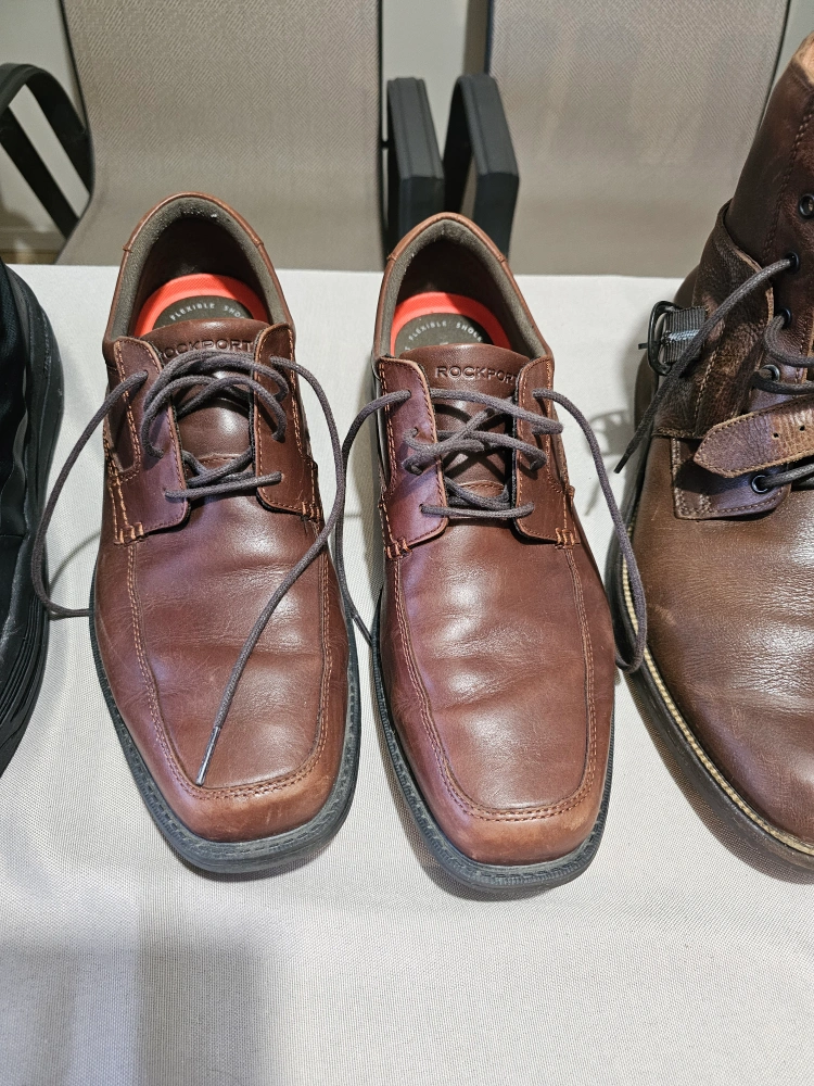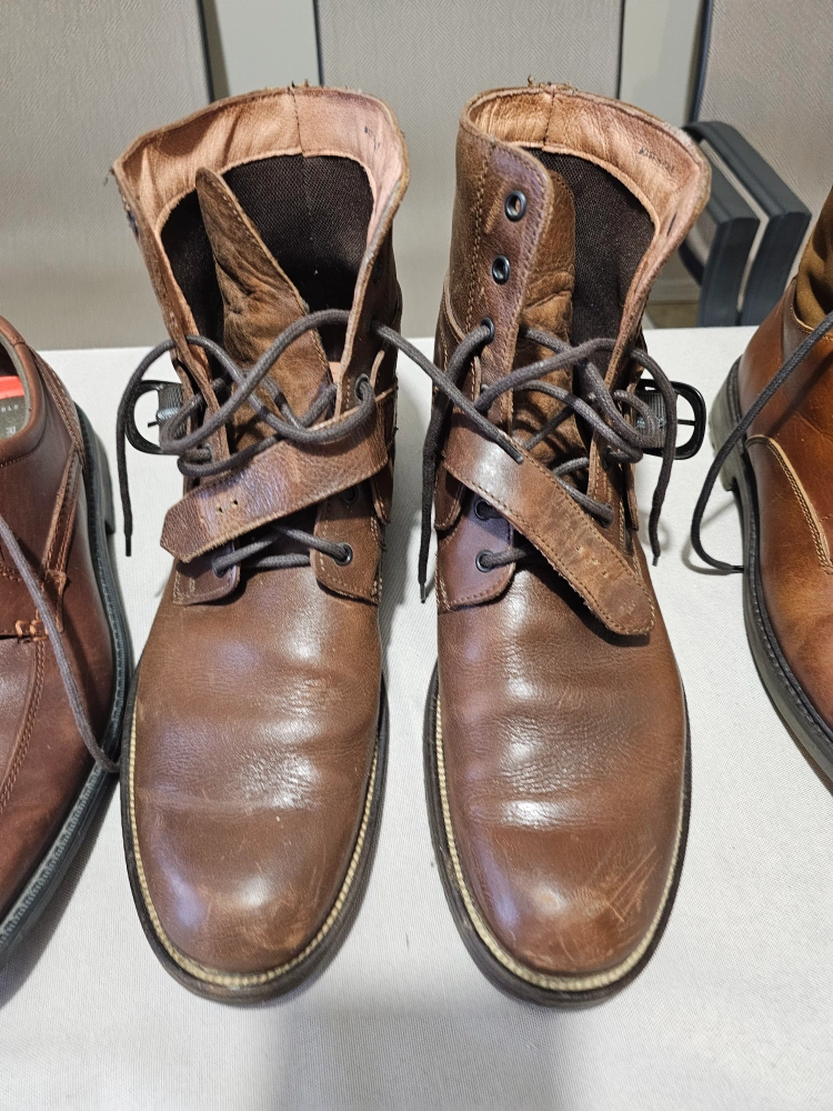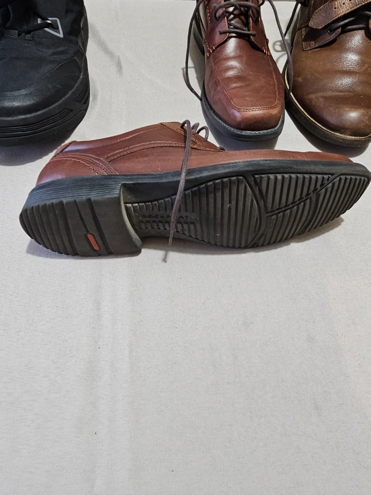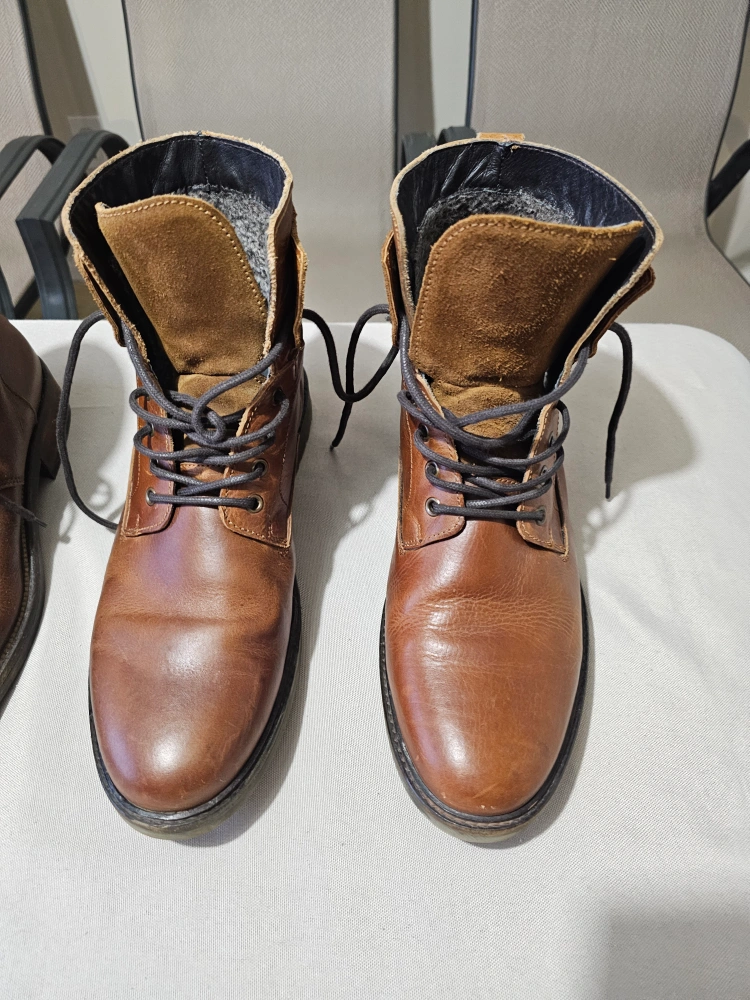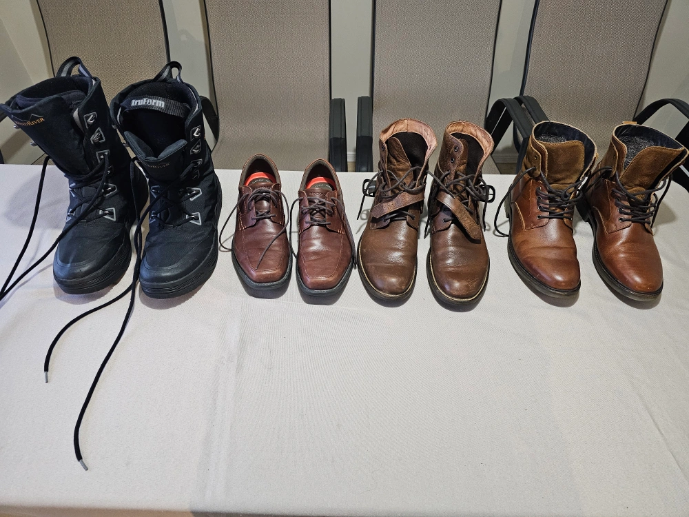 all shoes and boots are leather except the winter boots that are windriver. those are rated to -30 and those are $40. the Columbia are 30. the others are 20.