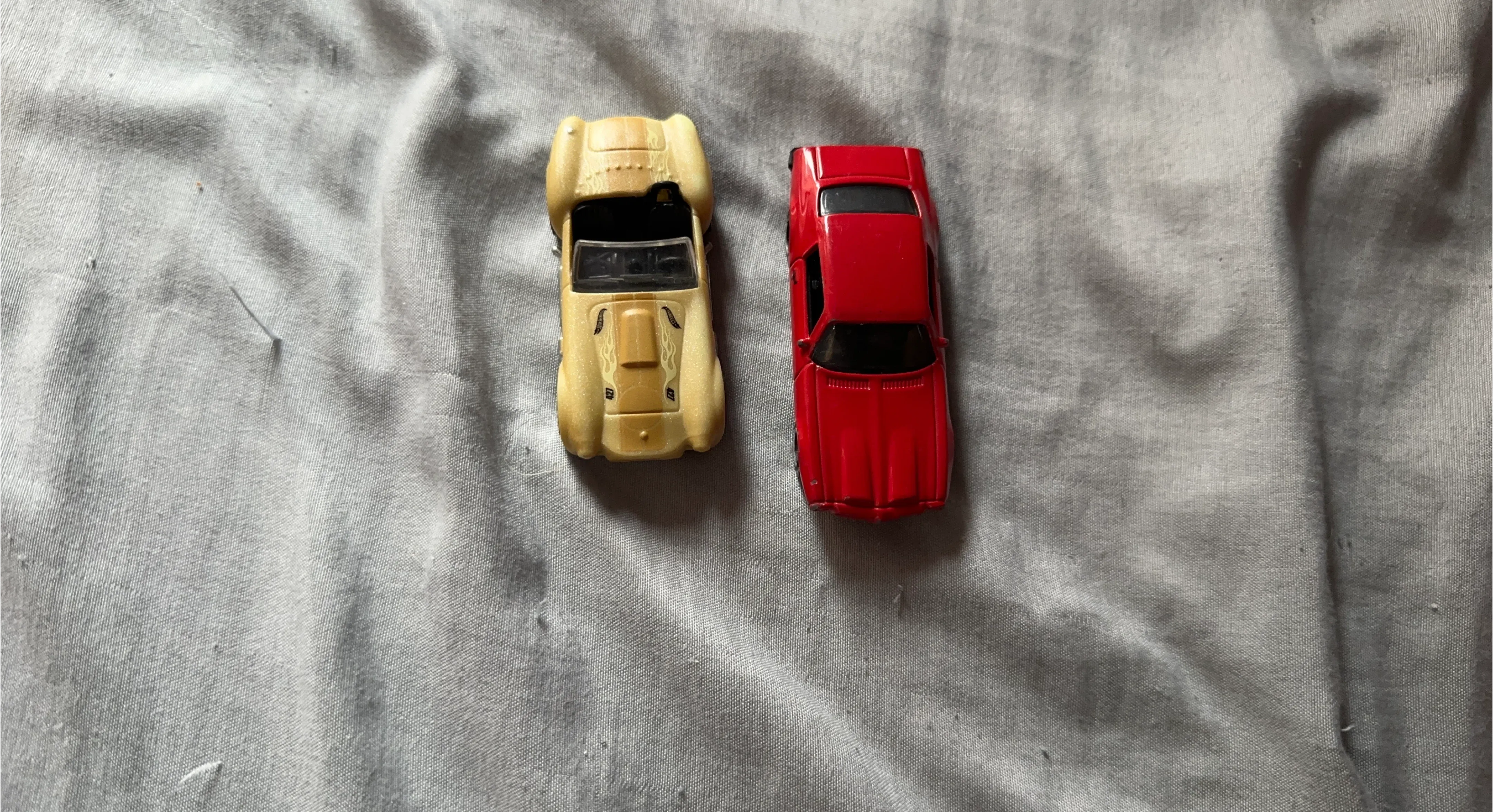 This listing includes two die-cast toy cars. One is red, and the other is a metallic gold colour with flame decals. Both are approximately 3 inches long.