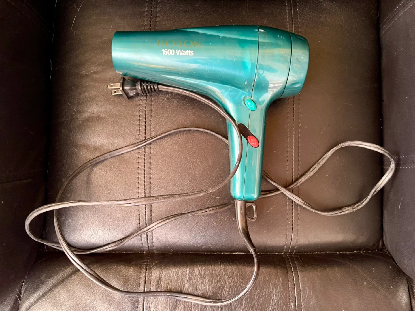 This Revlon hair dryer offers 1600 watts of power for efficient drying. It has a teal green colour and features two heat settings. It's a handy tool for quick blow-drying. Works perfectly.