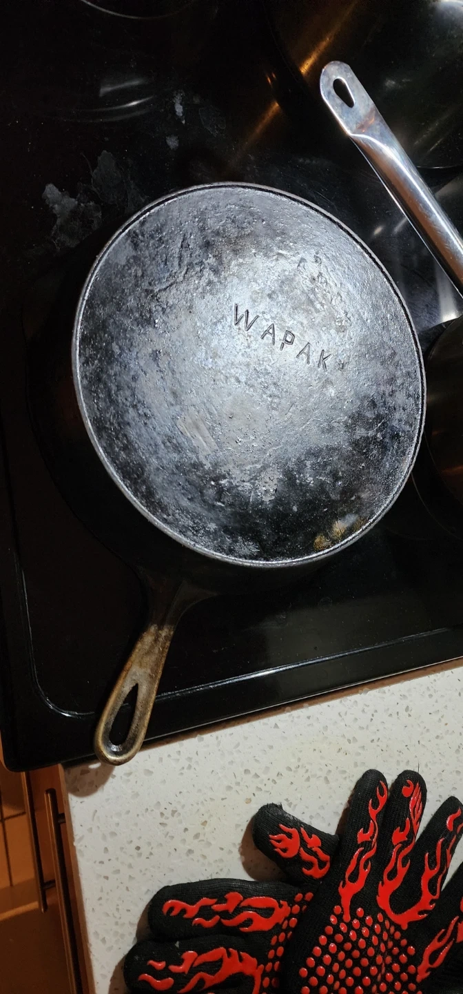 Pre-seasoned Wapak cast iron skillet. Heavy-duty construction for even heating. This pan's great for searing meats or frying up breakfast! It's ready for your kitchen.