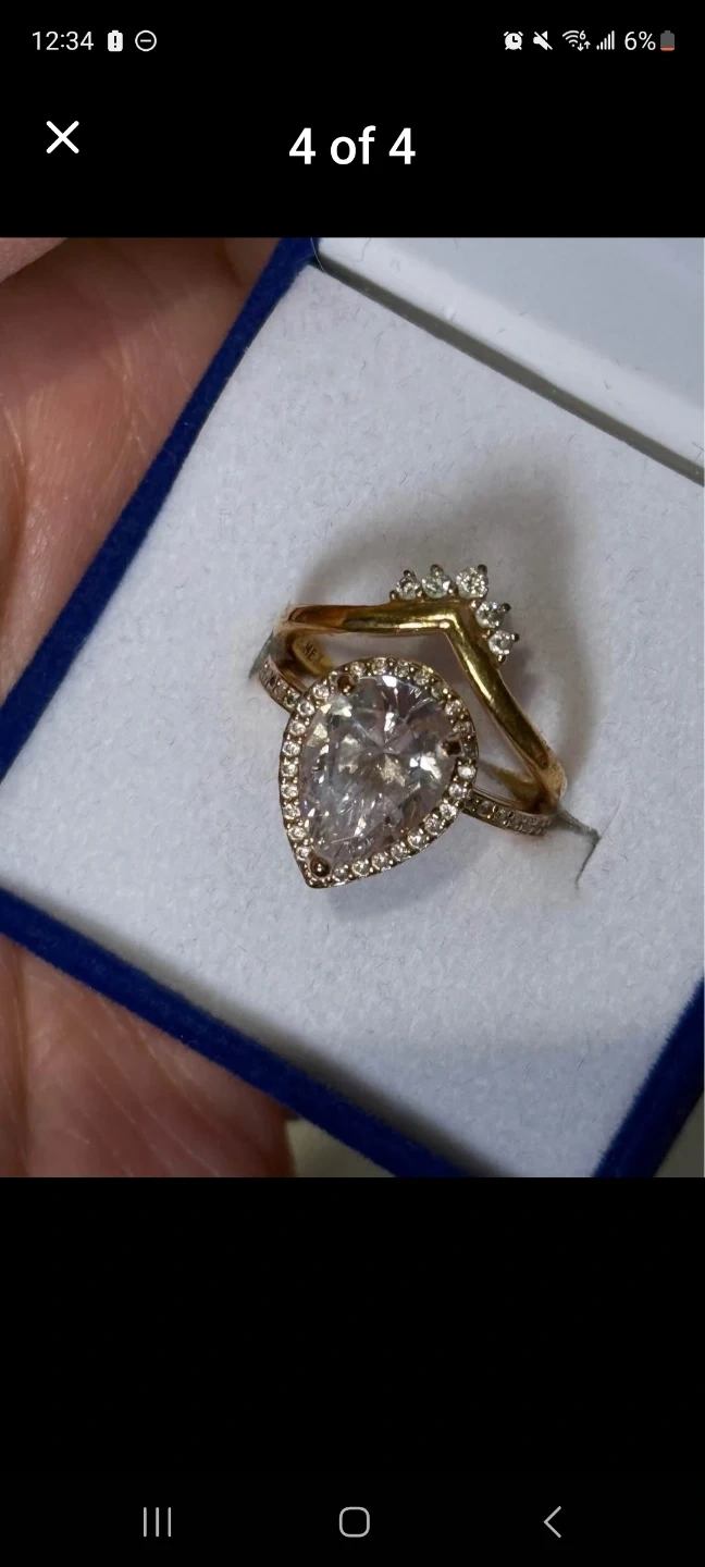 Beautiful pear-cut engagement ring and matching band. Both rings are adorned with sparkling stones, giving them a lovely shimmer. This set is ready to make a statement!