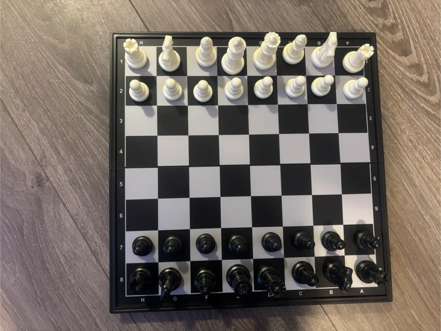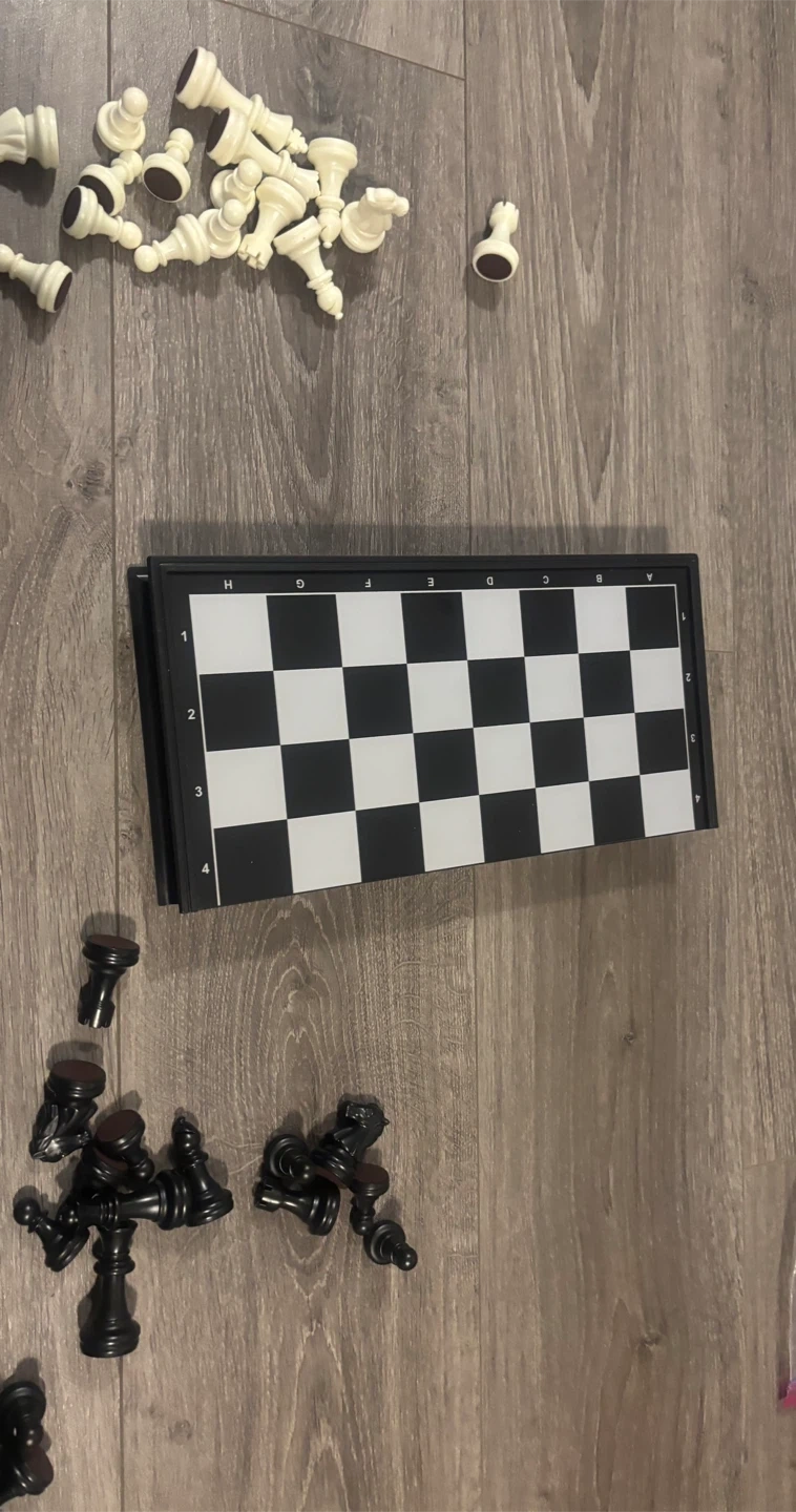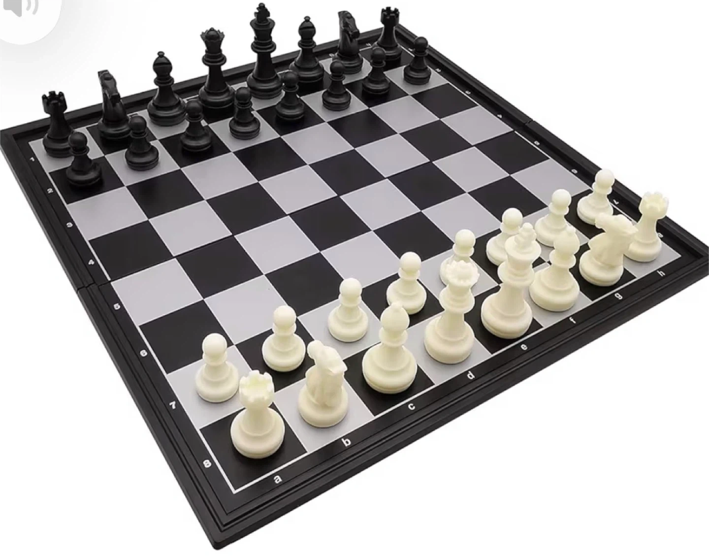 This is a complete magnetic chess set, perfect for playing on the go. It includes all the pieces and a foldable board for easy storage. Pieces are black and white plastic.
