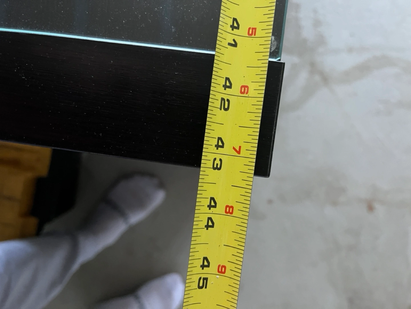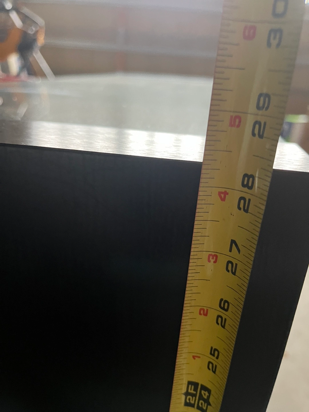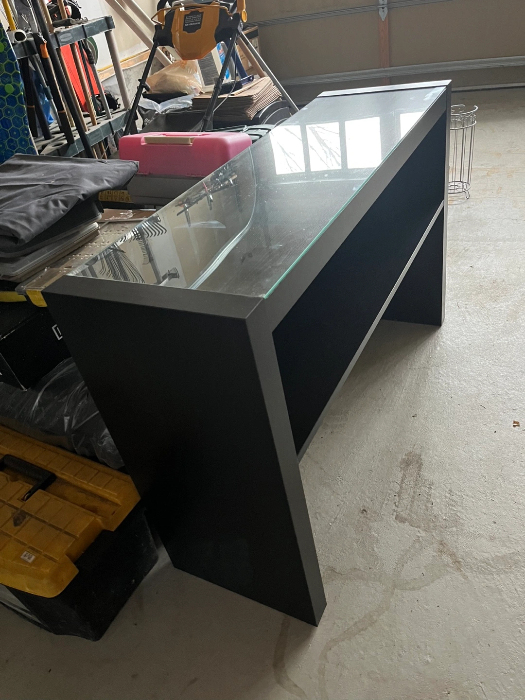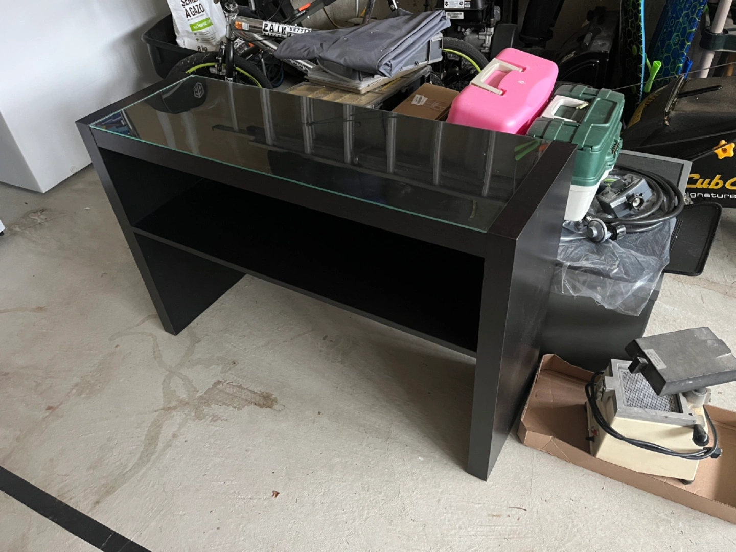 Modern console table. Black frame, glass top. One shelf. Approximately 30" tall, 48" wide, 12" deep. Good condition.