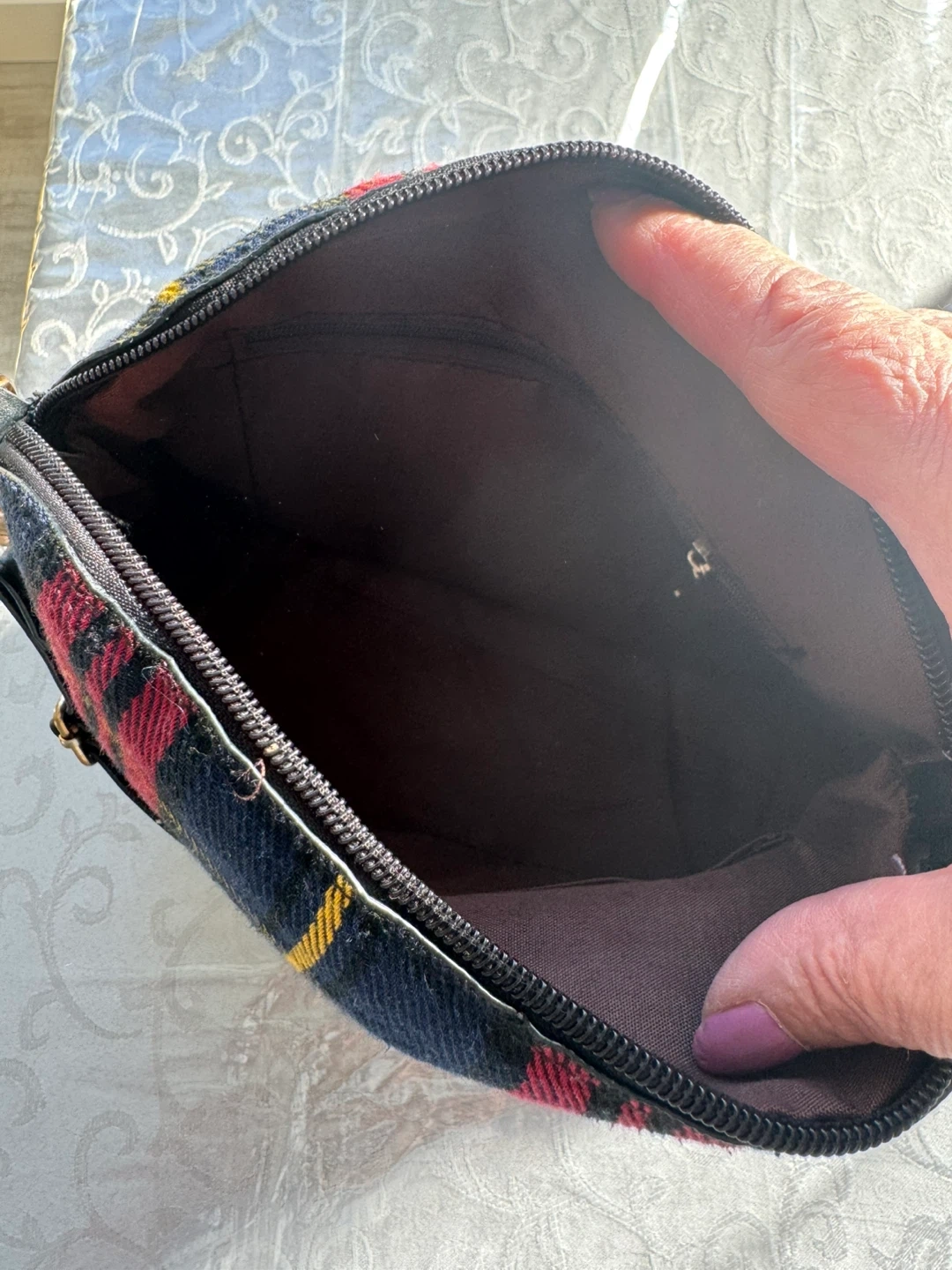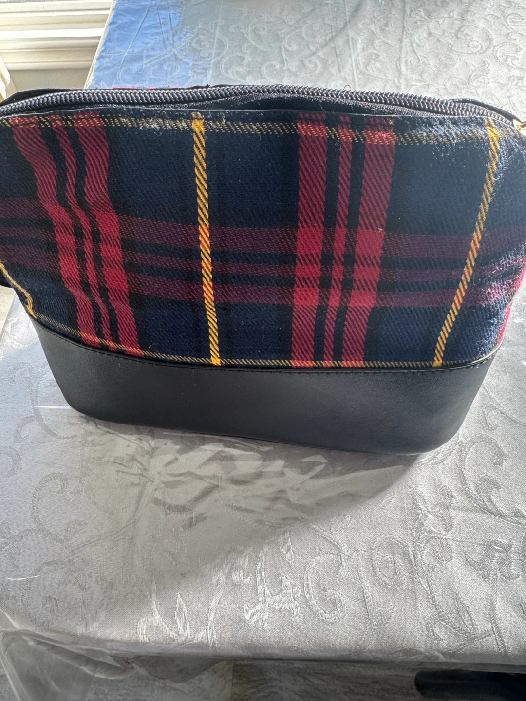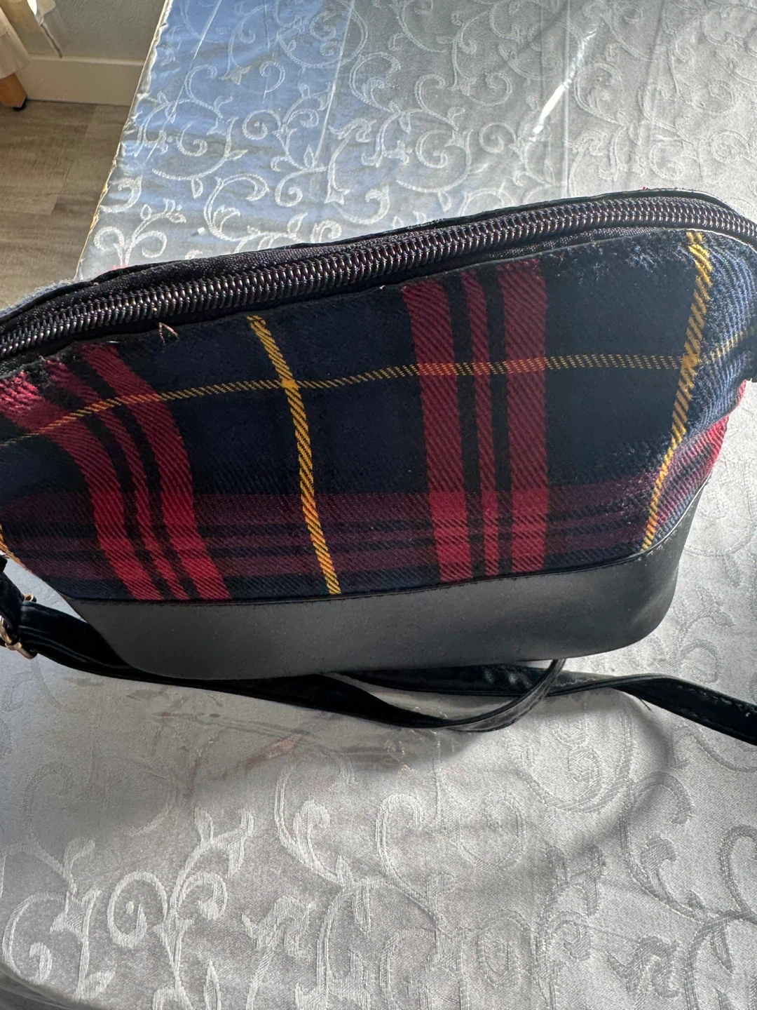 This is a stylish crossbody bag with a plaid fabric front and a black faux leather bottom. It features a zippered closure and a faux leather strap. The interior is lined.