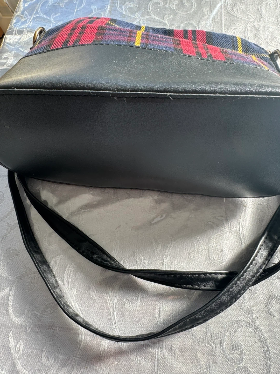 This is a stylish crossbody bag with a plaid fabric front and a black faux leather bottom. It features a zippered closure and a faux leather strap. The interior is lined.