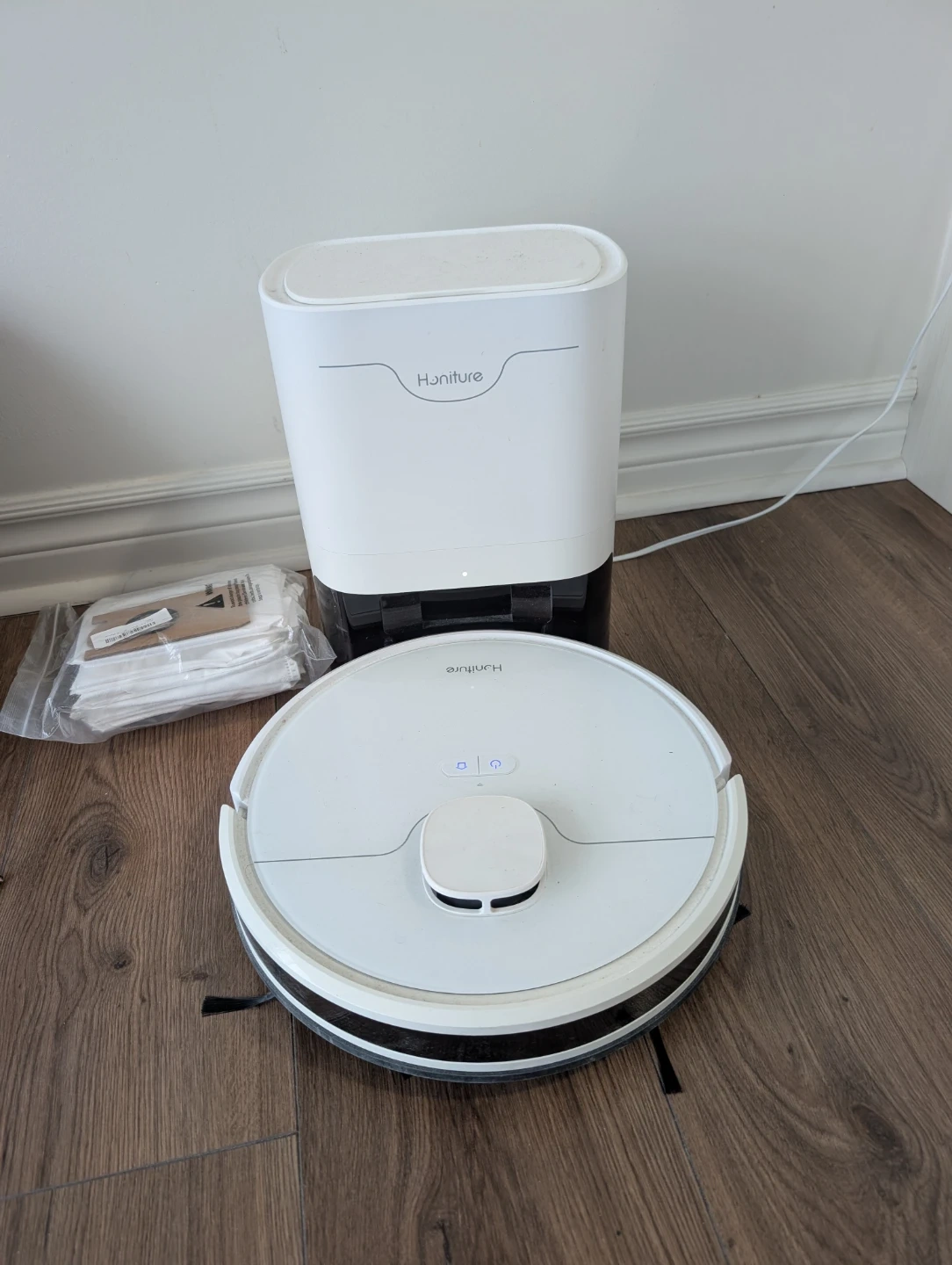 This Honiture robot vacuum and mop is white. It includes the robot and its charging base. Also inclused extra vaccum bags