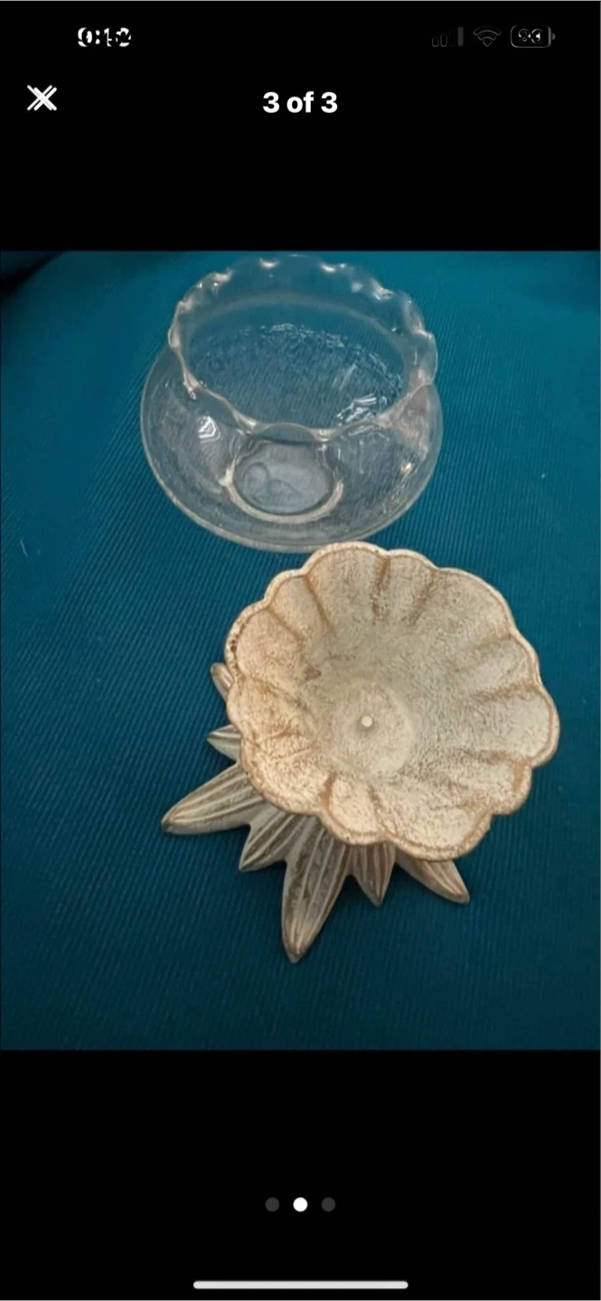 This is a decorative glass candy dish with a unique ornate base. The glass bowl has a ruffled edge and the base resembles a starburst or flower design. It's perfect for holding small treats or as a decorative accent piece.