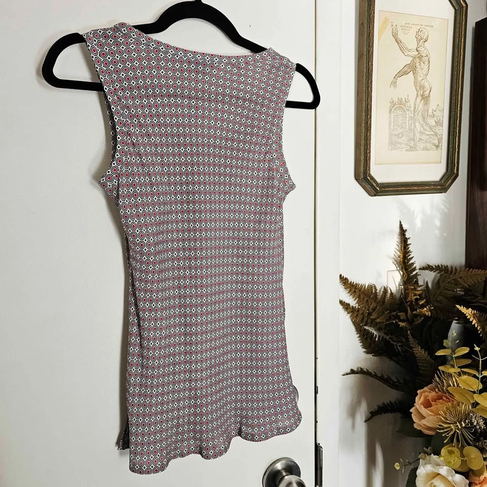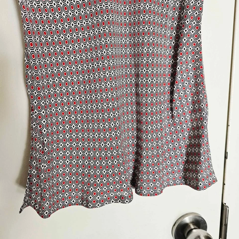 Stylish 100% silk sleeveless tank top from luxury brand Theory. Top is white and has a bold all-over mod inspired navy blue and red geometric pattern. Perfect for layering or wearing on its own in warm weather.