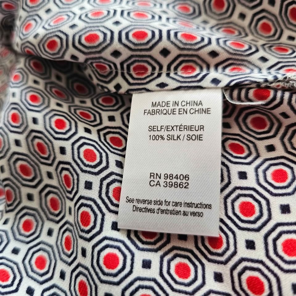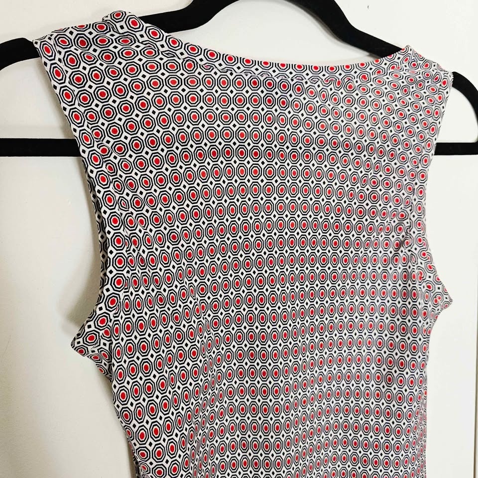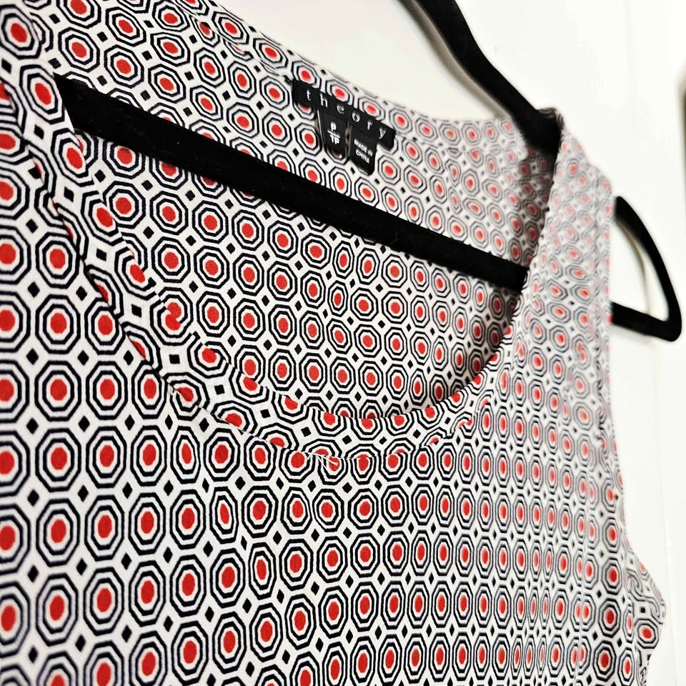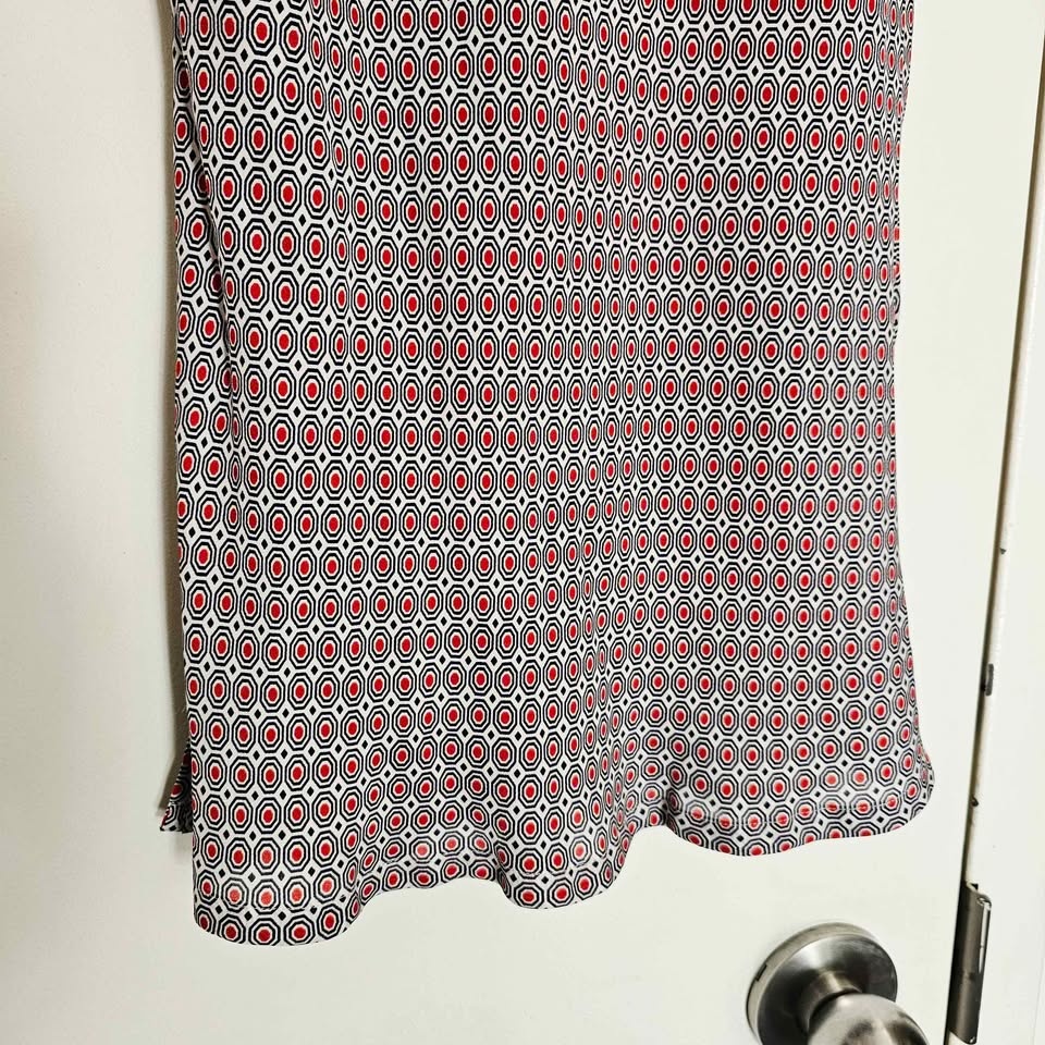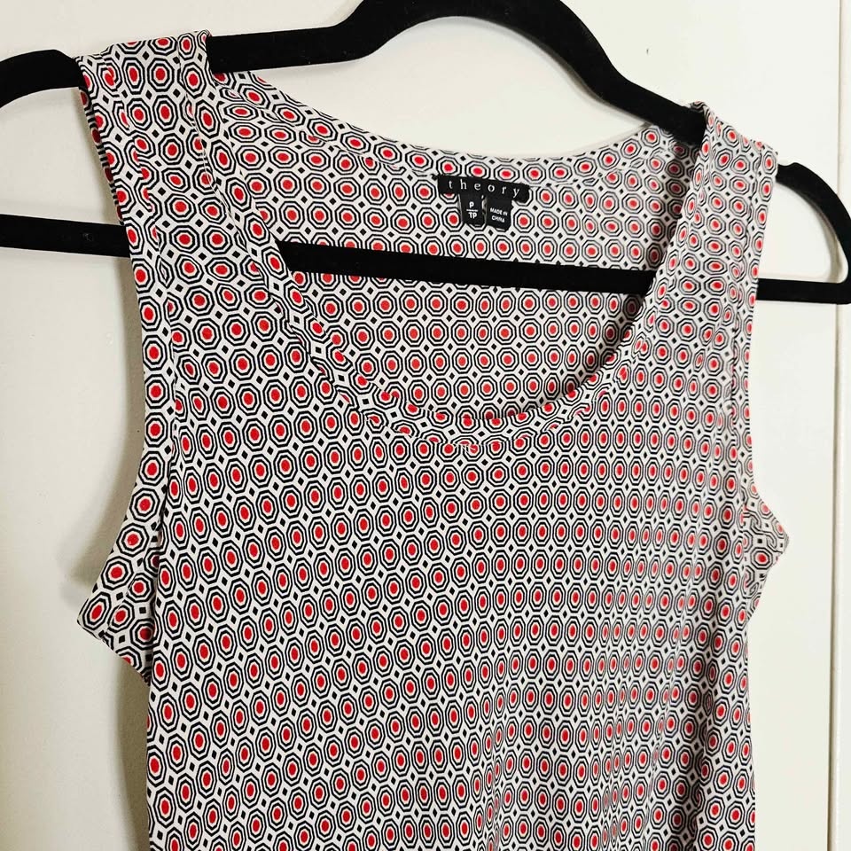 Stylish 100% silk sleeveless tank top from luxury brand Theory. Top is white and has a bold all-over mod inspired navy blue and red geometric pattern. Perfect for layering or wearing on its own in warm weather.