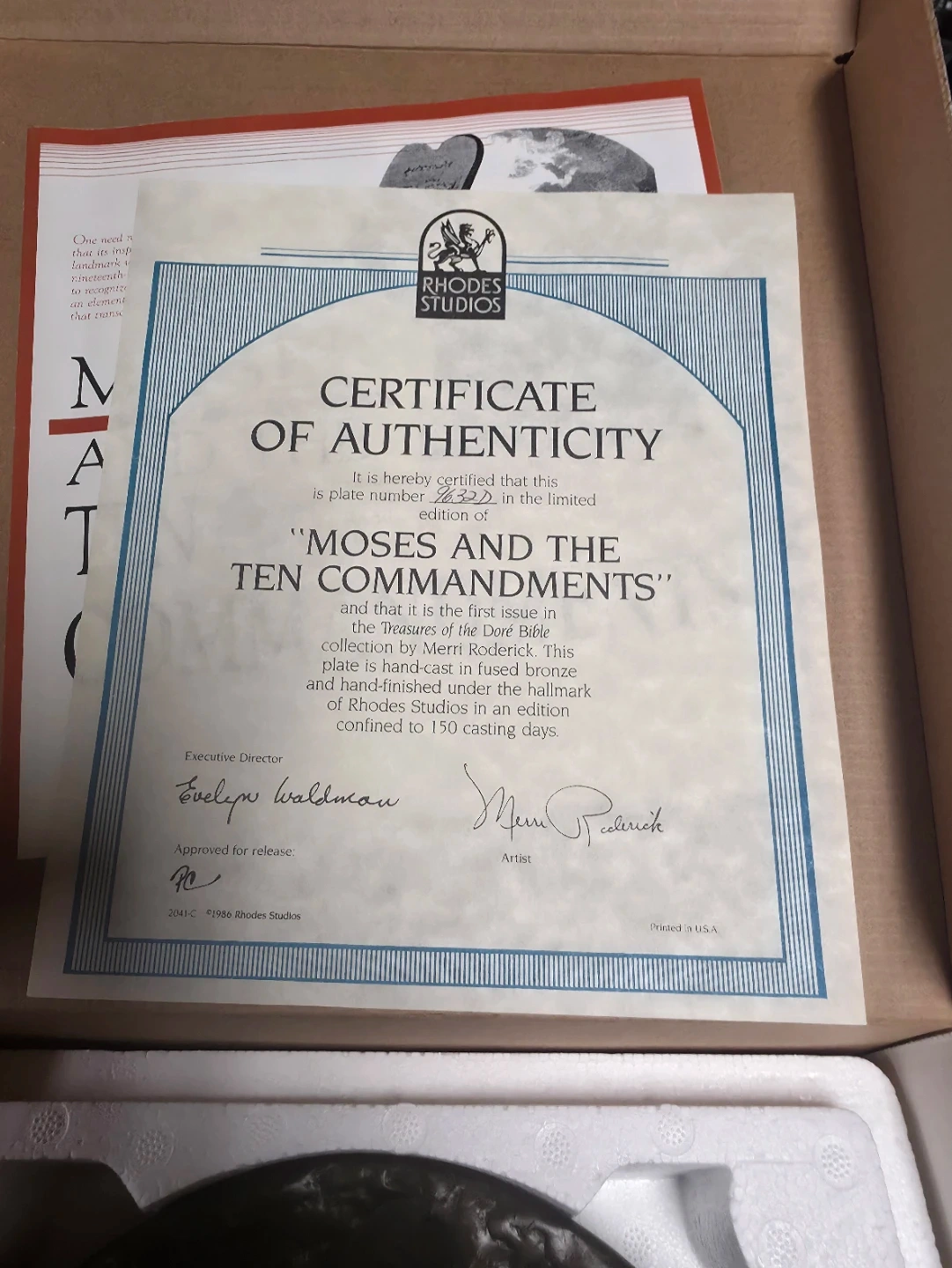 This is a Rhodes Studios "Moses and the Ten Commandments" plate. It's crafted from fused bronze and hand-finished in a limited edition. This plate is from the collection "The Treasures of the Holy Bible".