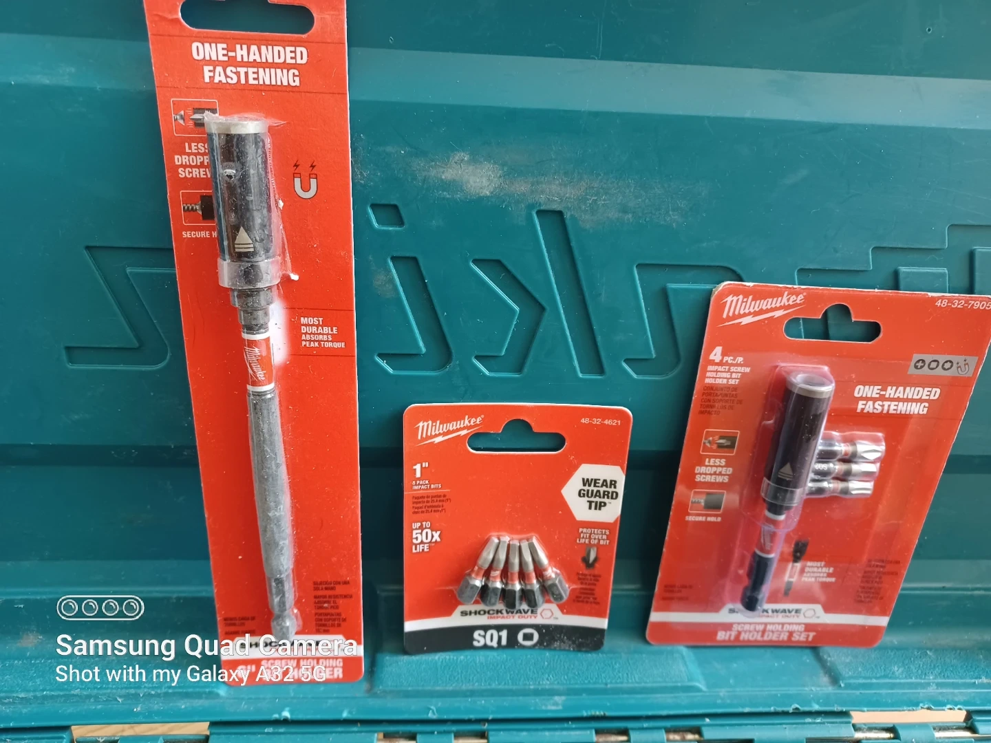 This Milwaukee set includes two one-handed fastening screw holding bit holders. One holder is for 1" "Shockwave" bits and is designed for up to 50x life. The other is a 4-piece "Shockwave" screw holding bit holder set. These tools make one-handed fastening easier by reducing dropped screws..only 1 battery..set in great condition..